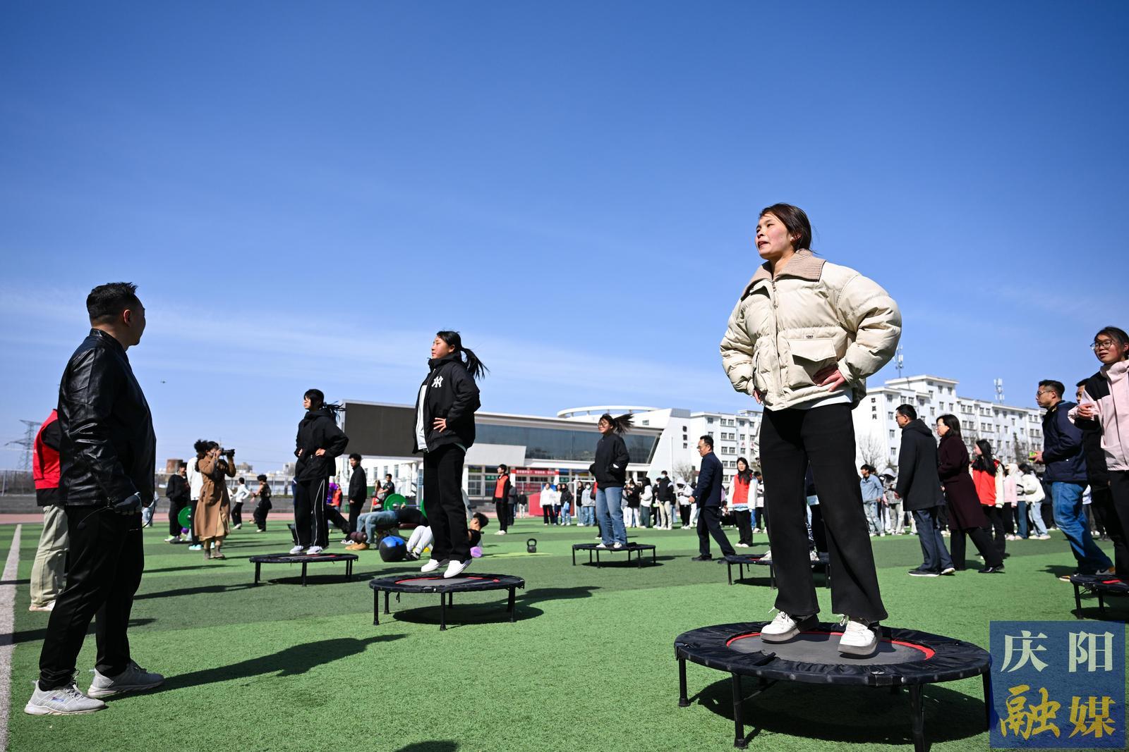 現(xiàn)場舉行了活動啟動儀式,隨后,運(yùn)動體驗(yàn)區(qū)開展健身操、力量抗阻訓(xùn)練展示、花樣跳繩等團(tuán)體活動;校企合作區(qū)引入智能動感單車、安全蹦床,音樂蹦床課等趣味項(xiàng)目,實(shí)現(xiàn)“精準(zhǔn)監(jiān)測-科學(xué)干預(yù)-趣味實(shí)踐”的健康管理閉環(huán)。
