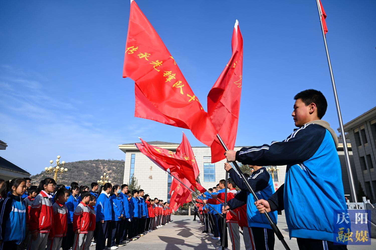 紅色傳承先鋒隊揮舞隊旗,從列寧小學出發(fā)。