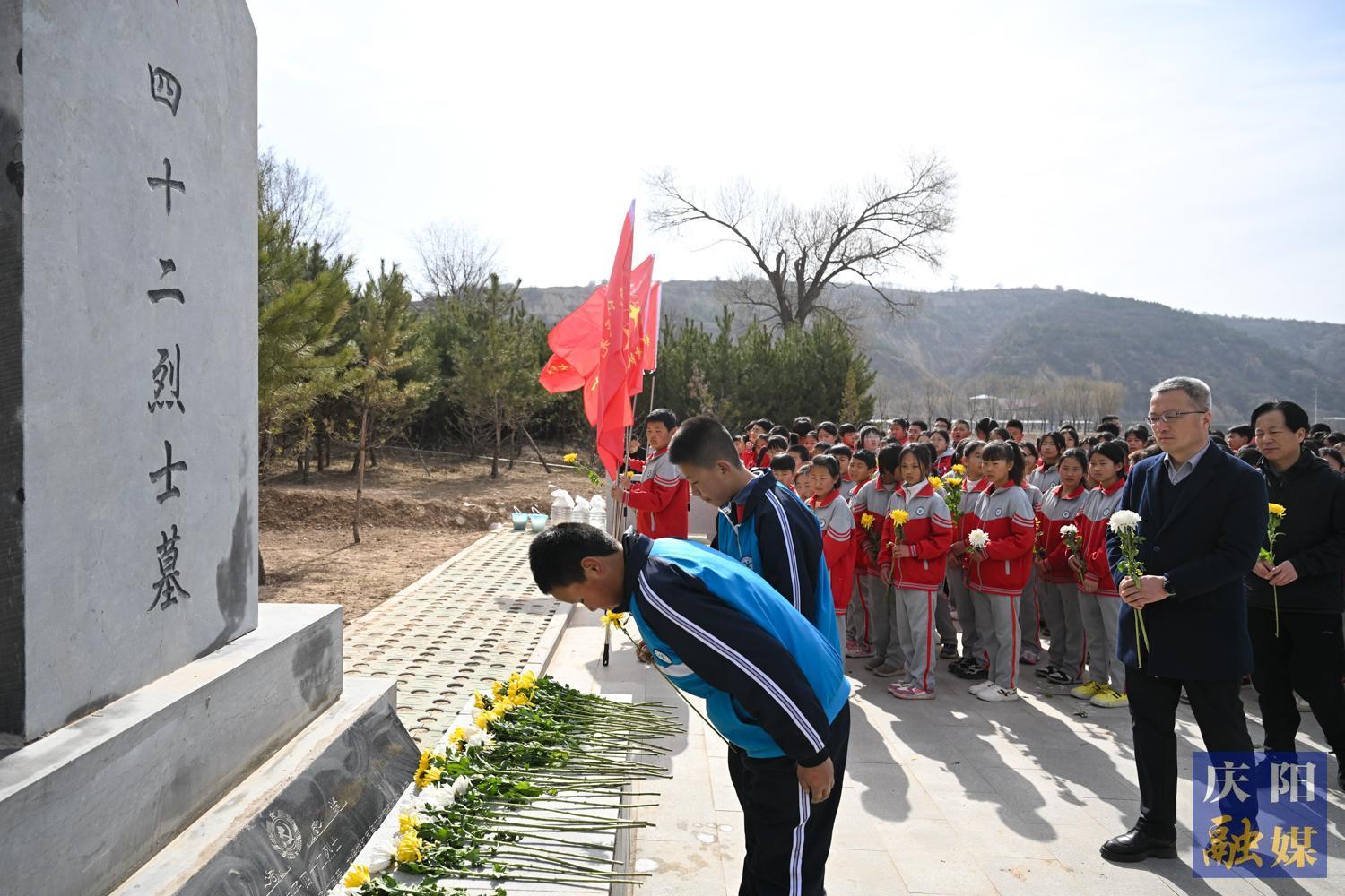學生們向閆洼子四十二烈士墓獻花、鞠躬。