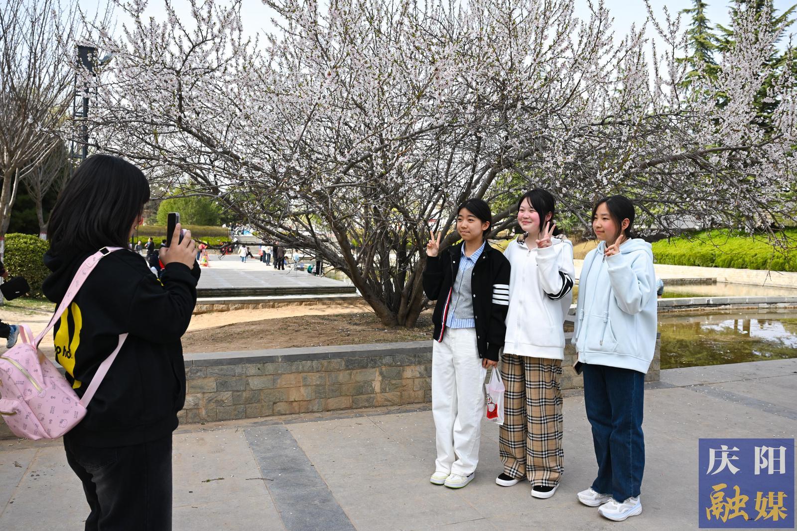 西峰區(qū)東湖公園杏花初開,吸引市民拍照打卡。
