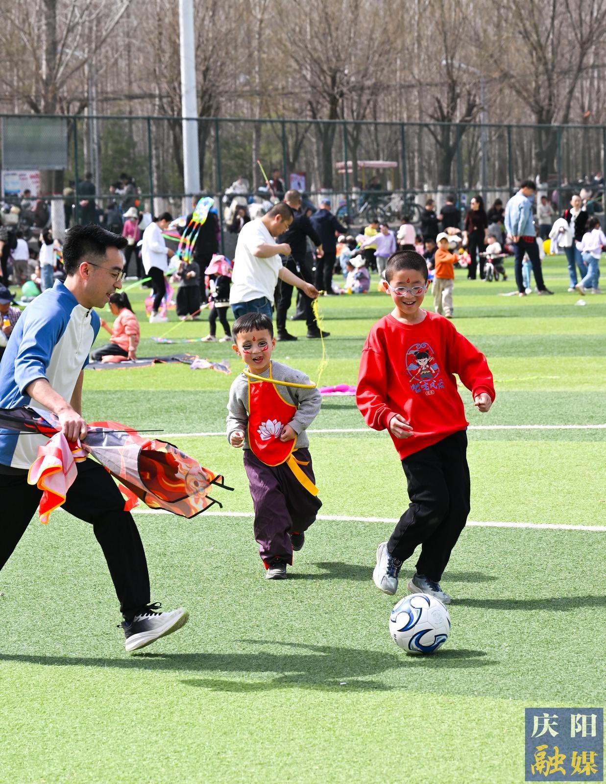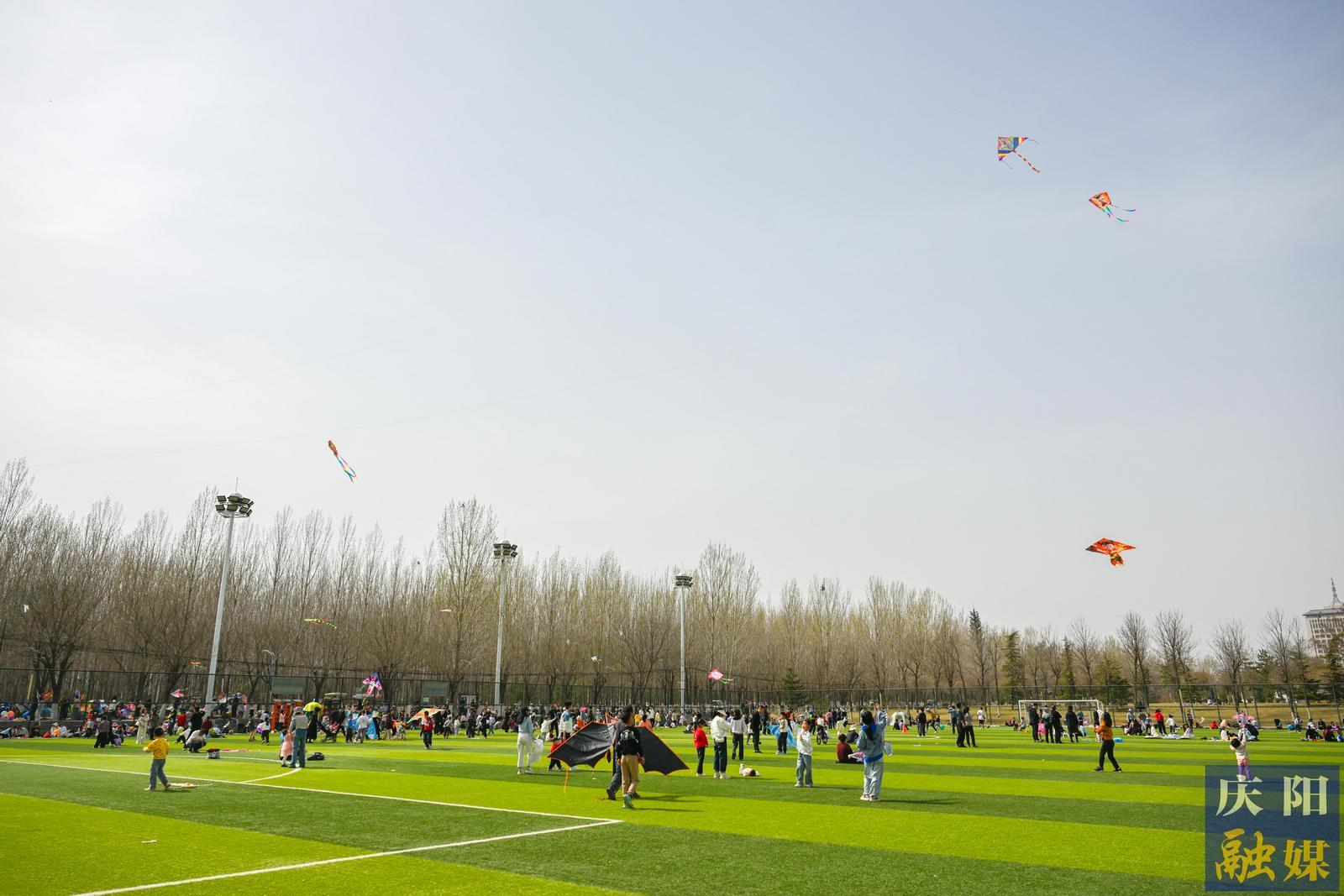 市民在慶陽市城市海綿運(yùn)動(dòng)綠地放風(fēng)箏,五顏六色的風(fēng)箏在空中競(jìng)相飛舞,熱鬧非凡。