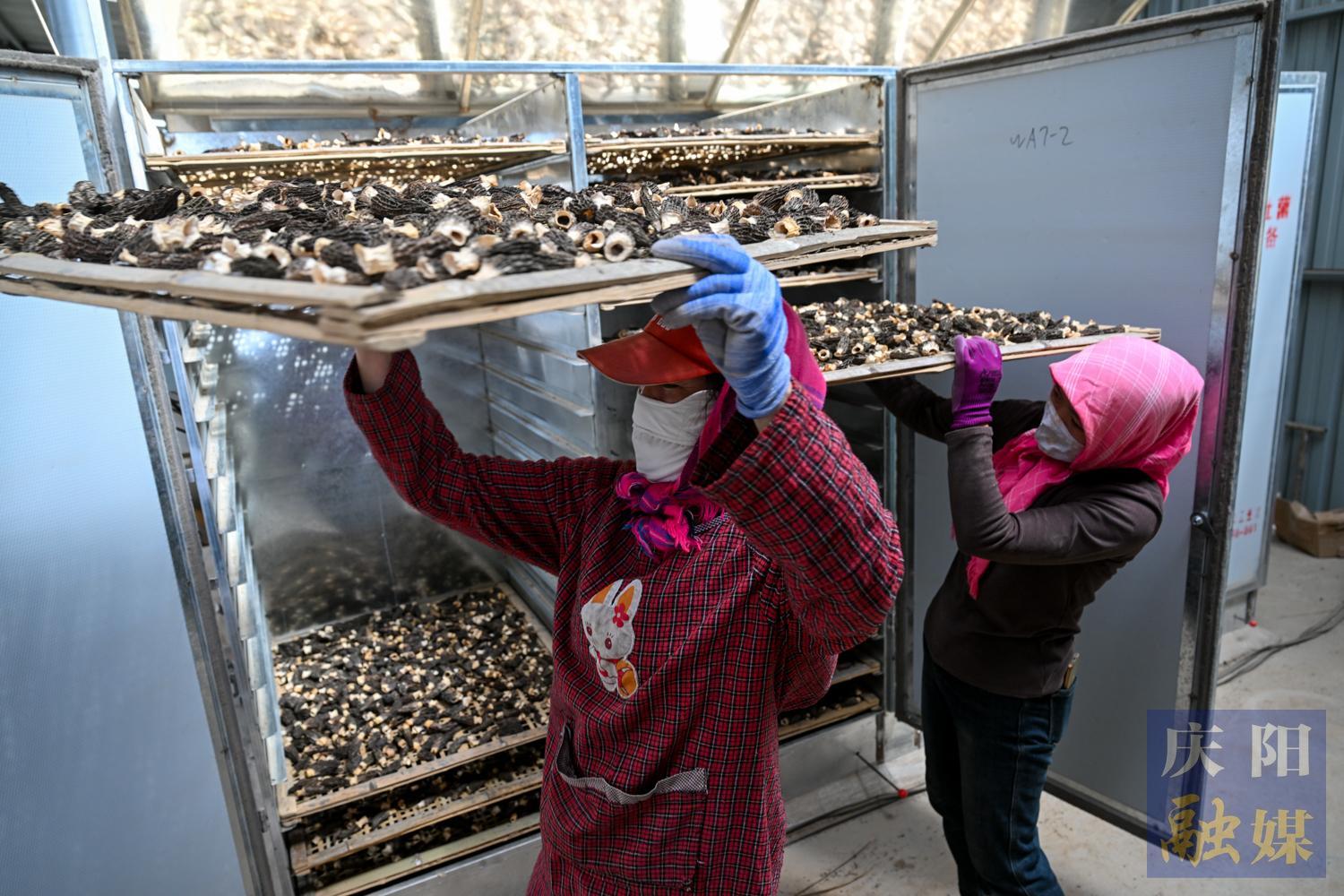 工人將烘干的羊肚菌從設(shè)備中取出。