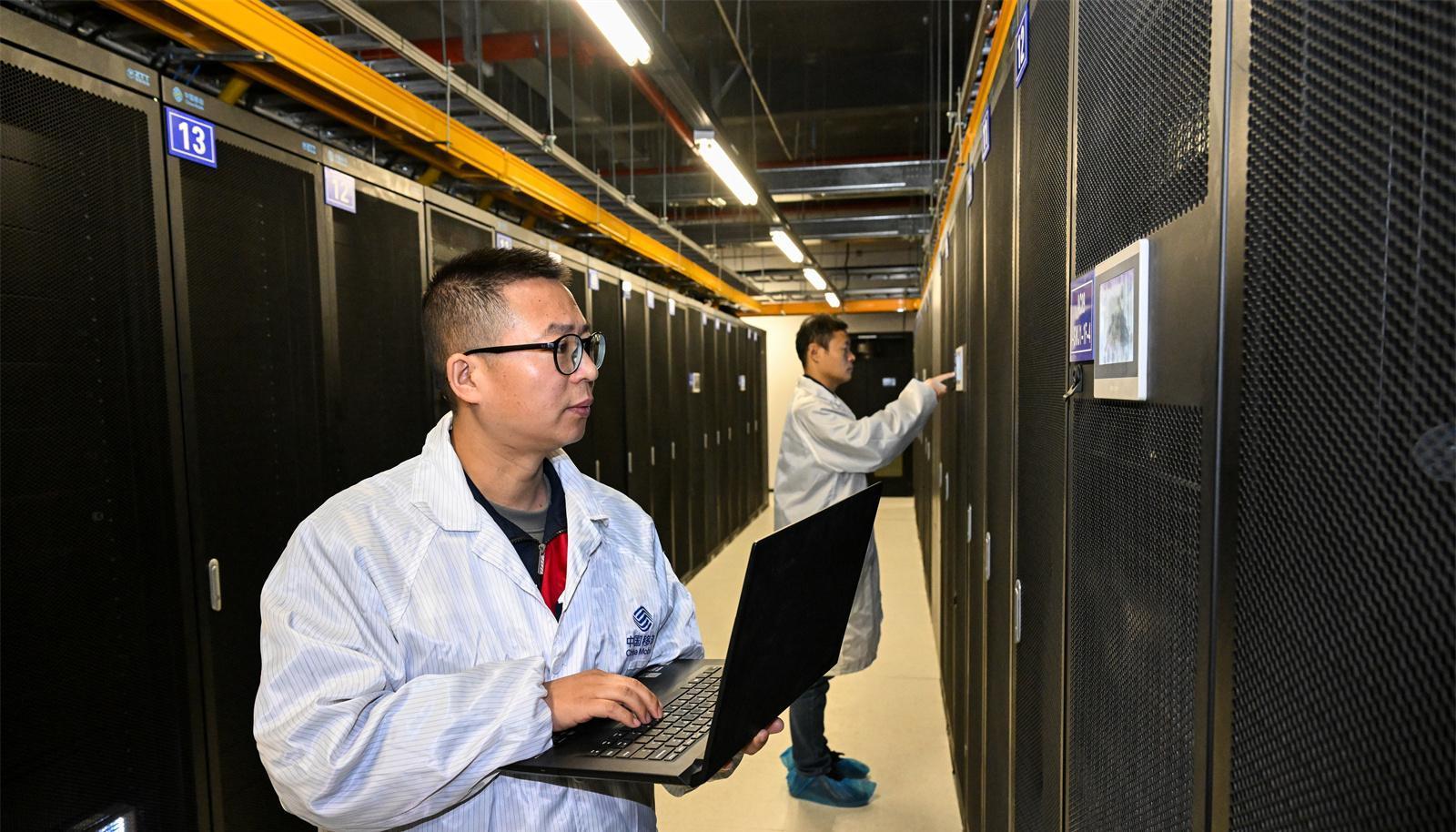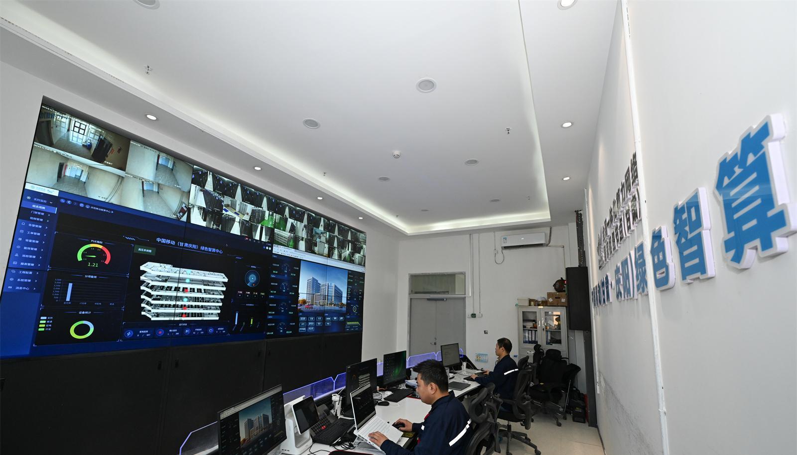 中國移動(dòng)(甘肅·慶陽)綠色智算中心,技術(shù)人員監(jiān)測算力設(shè)備狀態(tài)。