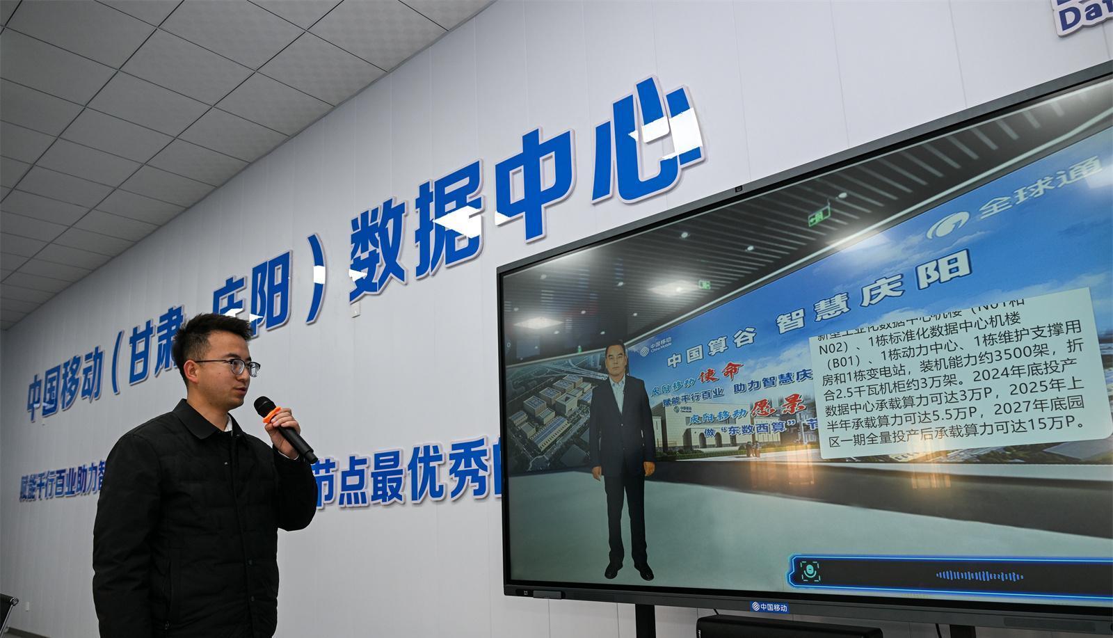 中國移動(dòng)(甘肅·慶陽)數(shù)據(jù)中心項(xiàng)目現(xiàn)場,工作人員與“數(shù)字人”對(duì)話交流。