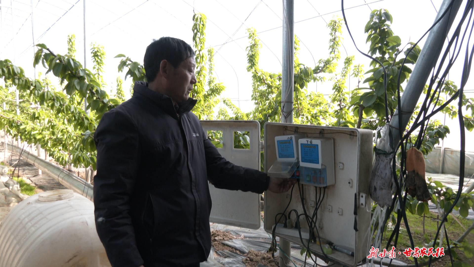 慶陽豐慶園種植農(nóng)民專業(yè)合作社負(fù)責(zé)人操控智能通風(fēng)開關(guān)。