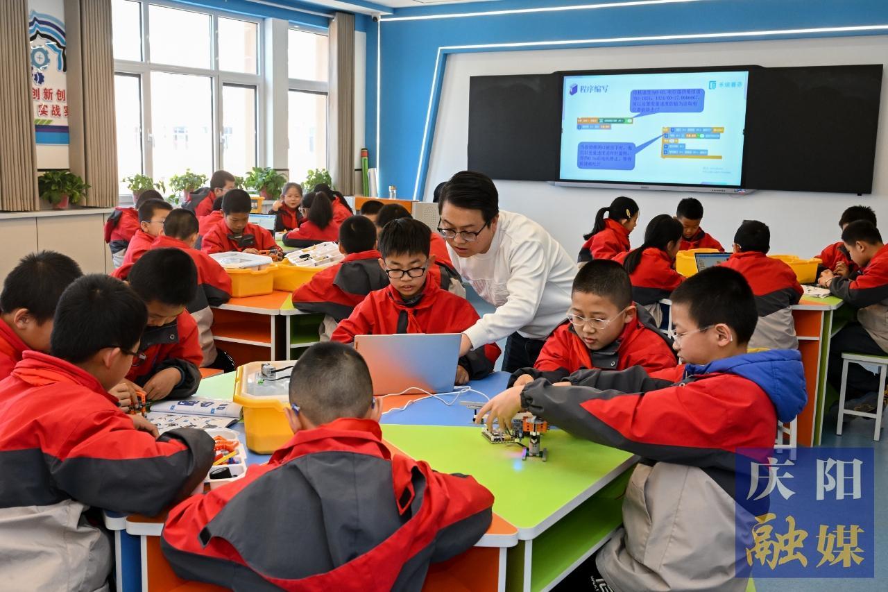 鎮(zhèn)原縣蓮池小學(xué),學(xué)生在創(chuàng)客教育課上學(xué)習(xí)程序編寫(xiě)知識(shí),組裝創(chuàng)意編程套件。慶陽(yáng)融媒記者 俄少飛 攝