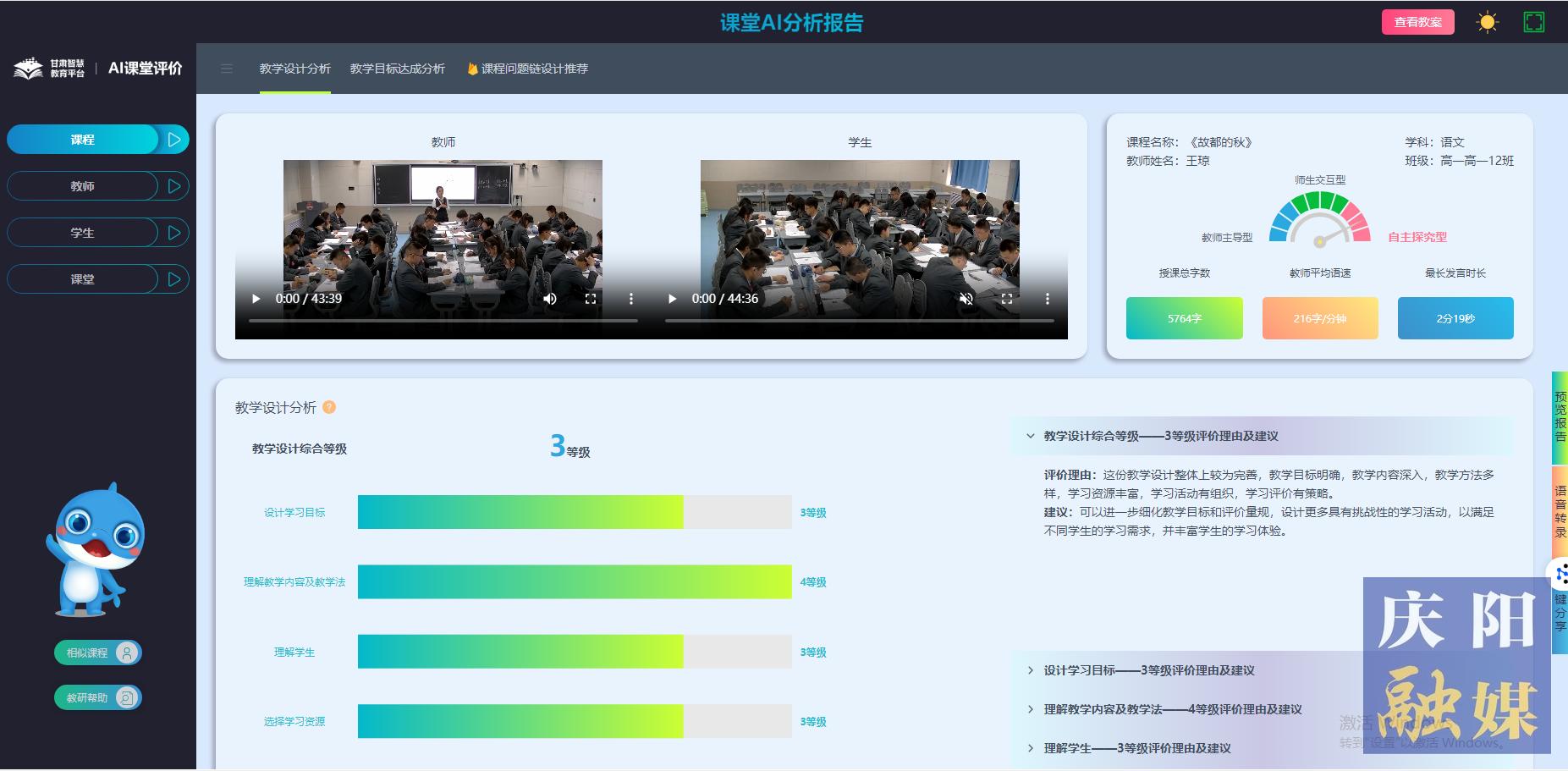 在北師大慶陽(yáng)實(shí)驗(yàn)學(xué)校的“AI智慧教室”,攝像頭無(wú)聲記錄著課堂細(xì)節(jié)。教師劉俊妮剛結(jié)束函數(shù)課,系統(tǒng)便自動(dòng)生成了一份課堂分析報(bào)告:“學(xué)生討論時(shí)間占28%,例題正確率91%,需強(qiáng)化三個(gè)典型錯(cuò)誤?!眻?bào)告不僅清晰呈現(xiàn)各項(xiàng)數(shù)據(jù),更以波形圖展示課堂節(jié)奏,助力教師精準(zhǔn)“把脈開(kāi)方”。