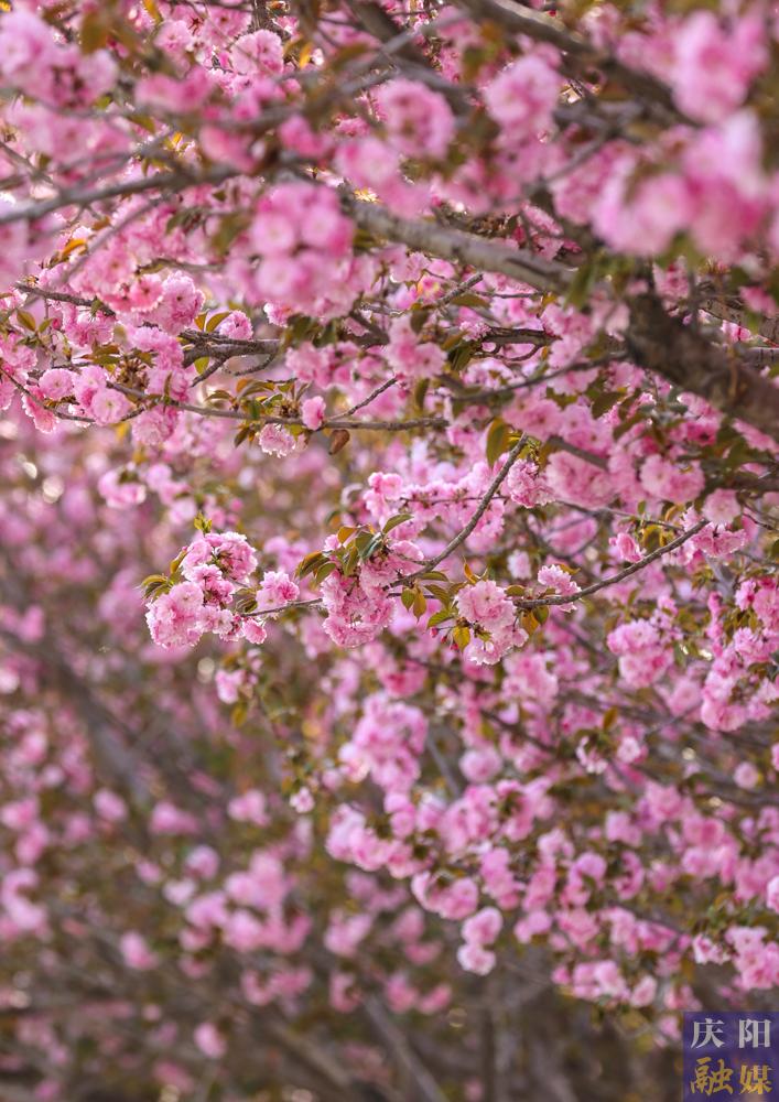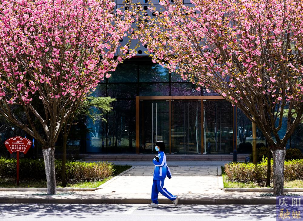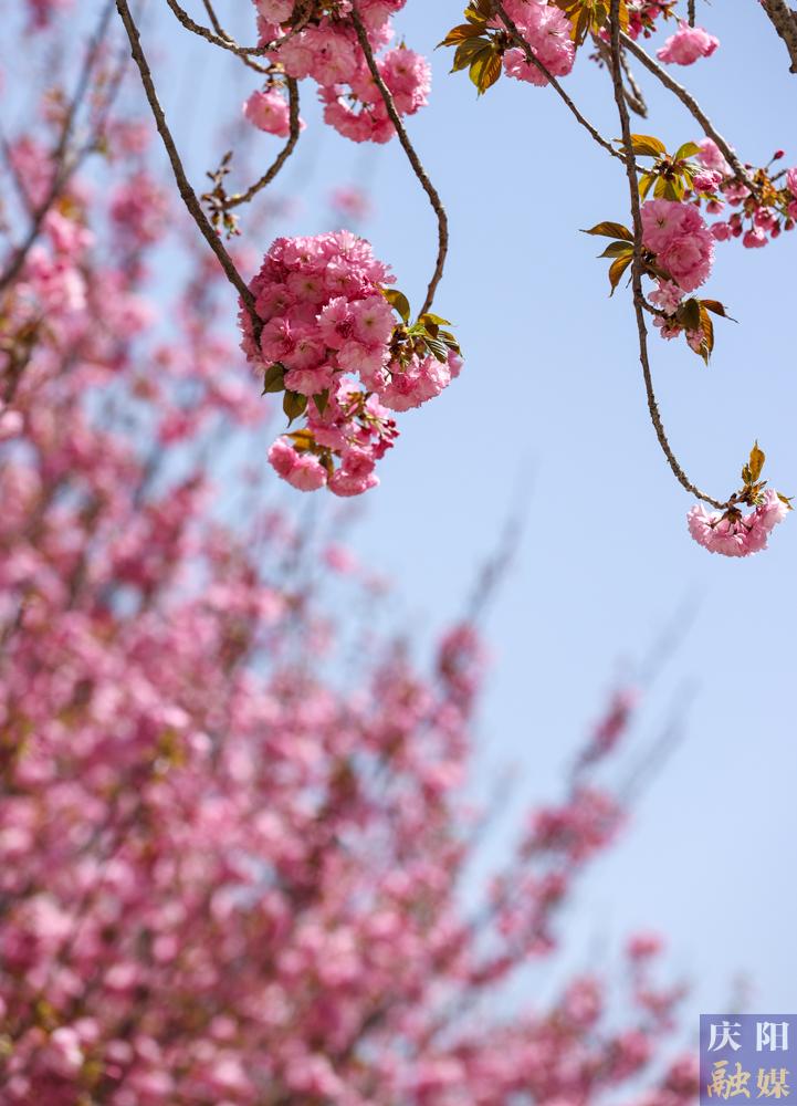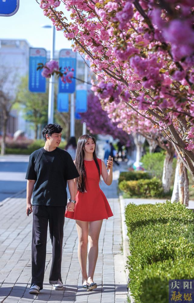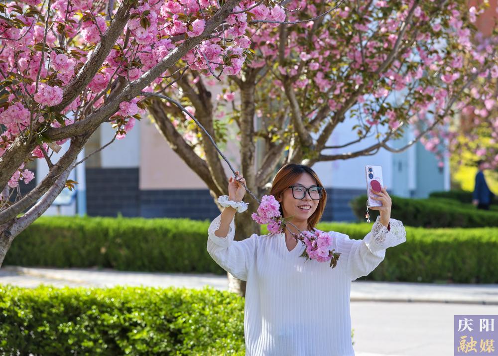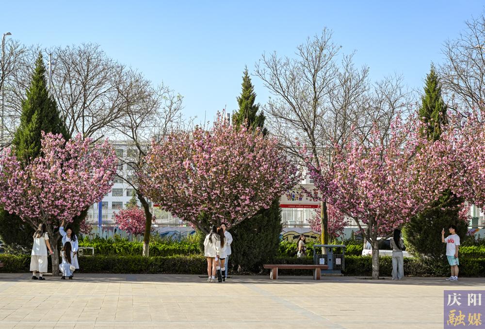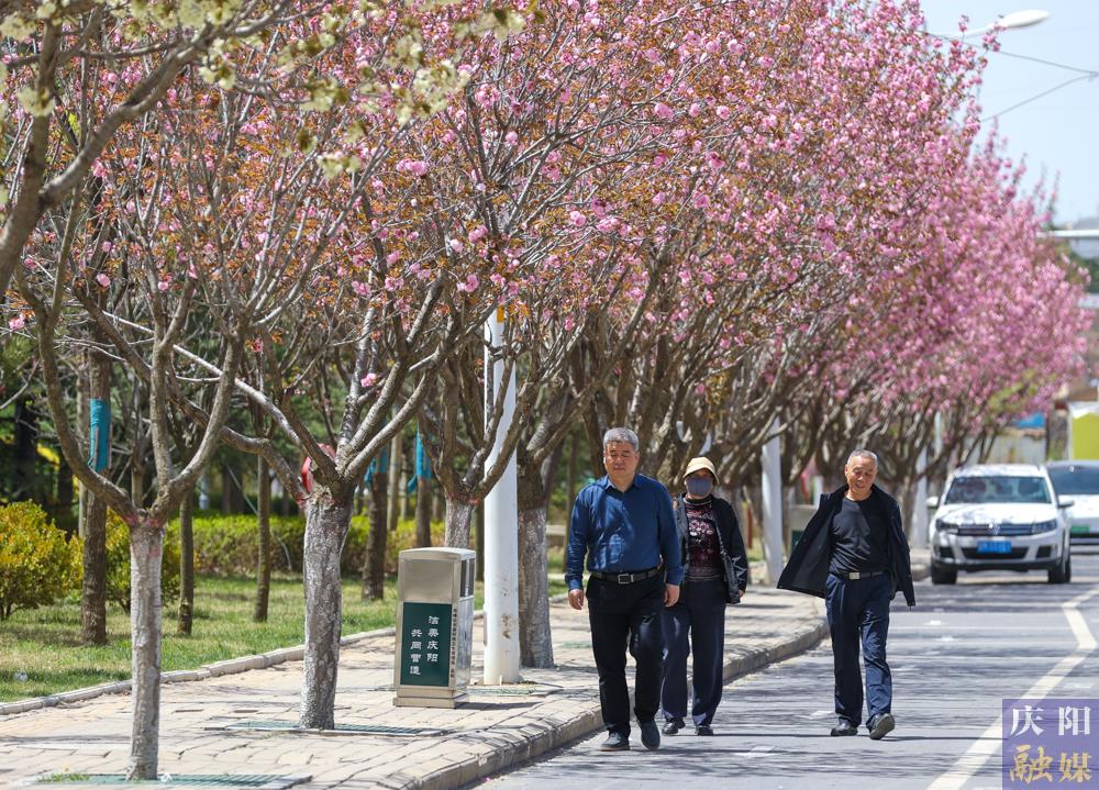 西峰區(qū)慶城東路櫻花盛開,成為市民賞花打卡的好去處。