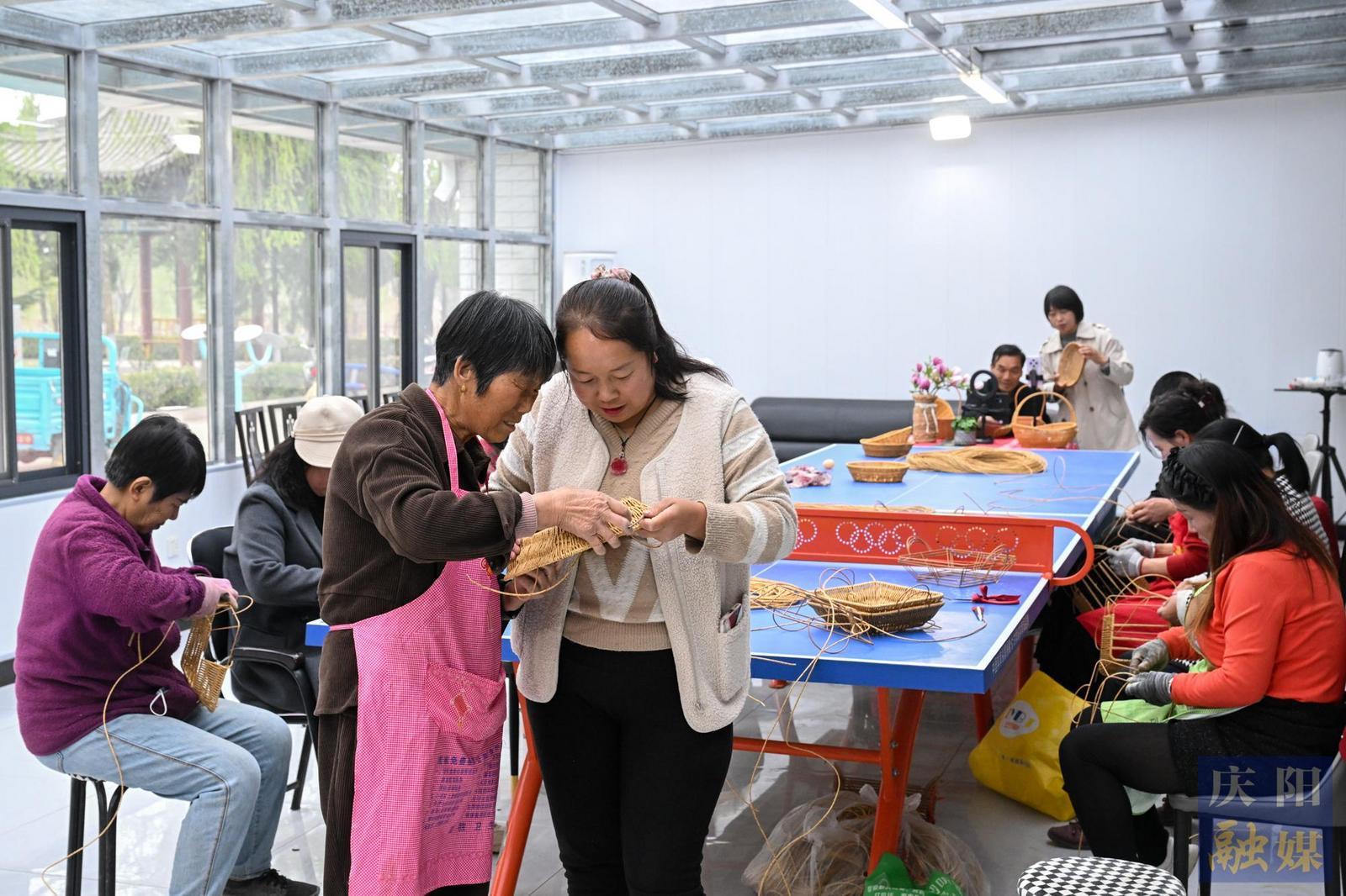 西峰區(qū)顯勝鄉(xiāng)冉李村“織夢(mèng)田園”手工藝工作室,婦女們?cè)诰幙椌赖墓P(pán)、花籃和藤編飾品。
