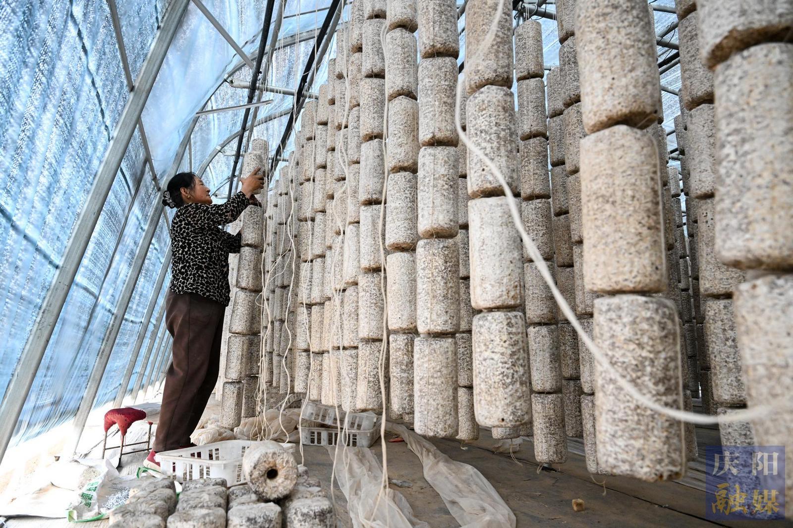 彭原鎮(zhèn)的慶陽(yáng)晶晶生物科技有限公司,工人在掛棒。