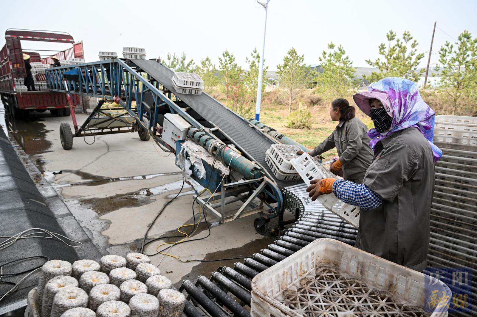 彭原鎮(zhèn)的慶陽(yáng)晶晶生物科技有限公司,工人將剛下線的菌棒裝車(chē)發(fā)往外地。
