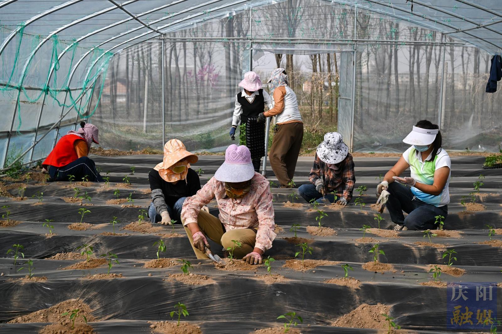 西峰區(qū)肖金鎮(zhèn)高原夏菜集約化生產(chǎn)示范基地,工人定植辣椒苗。