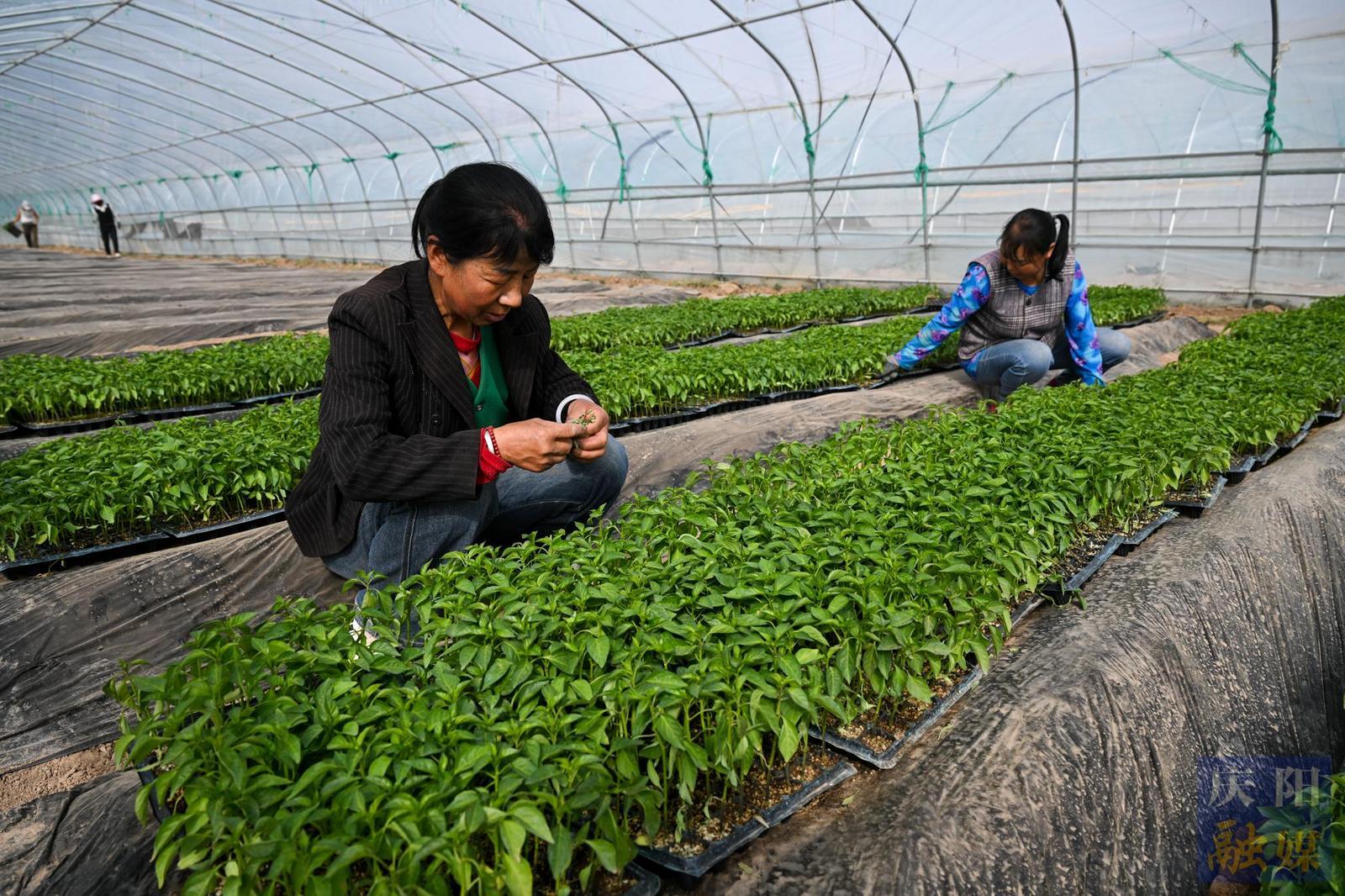 西峰區(qū)肖金鎮(zhèn)高原夏菜集約化生產(chǎn)示范基地,工人管護(hù)辣椒苗。