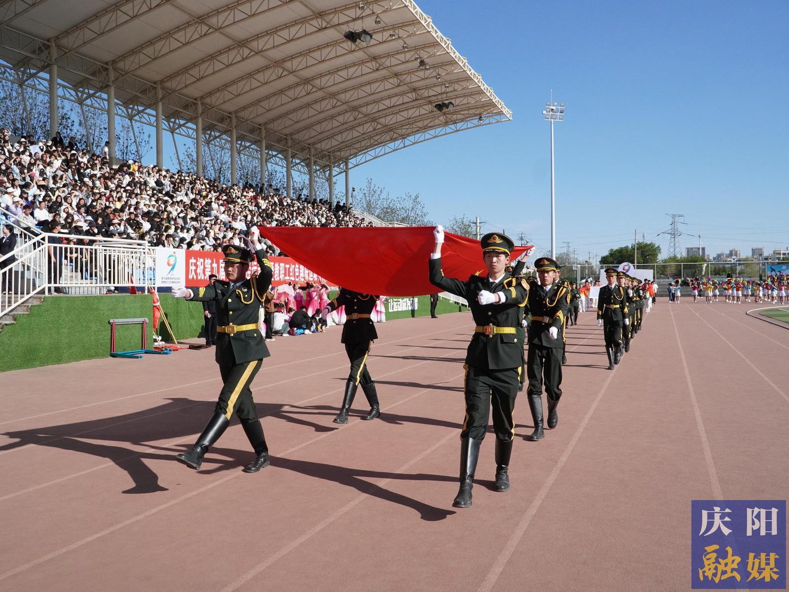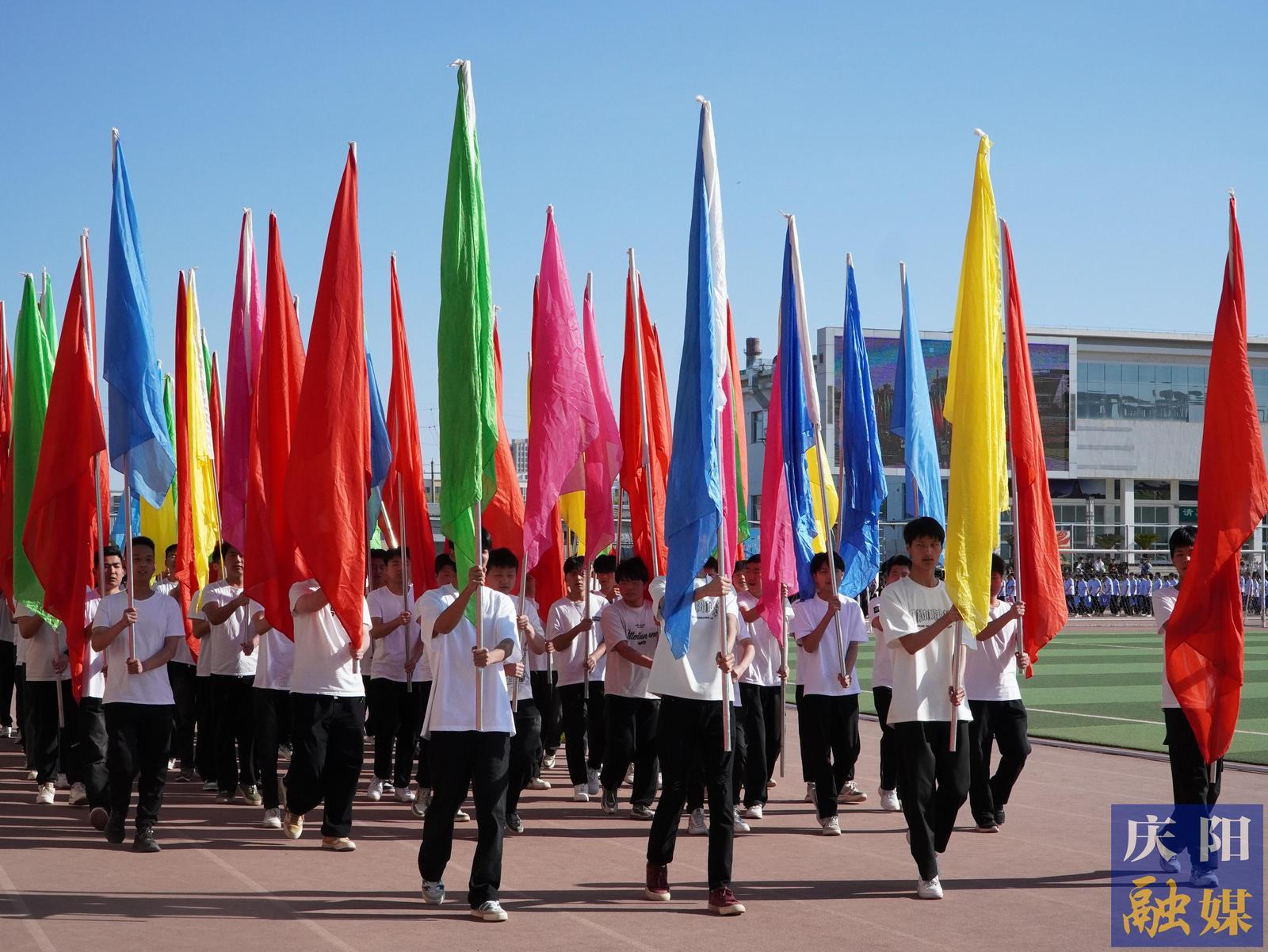 伴隨著鏗鏘的樂曲,國旗護(hù)衛(wèi)隊(duì)高擎五星紅旗率先入場,他們步伐整齊、目光堅(jiān)毅,紅色旗幟上的五顆金星輝映著新時代青年的使命擔(dān)當(dāng)。這支成立于2015年的隊(duì)伍,十年如一日踐行“護(hù)衛(wèi)國旗、報效祖國”的誓言,成為運(yùn)動會上最莊嚴(yán)的風(fēng)景。緊隨其后的是校旗、會徽方陣,慶陽職業(yè)技術(shù)學(xué)院?;罩型信e朝陽的雙手與翻開的書頁,象征著知識與理想的交融,會徽上躍動的數(shù)字“9”與三色環(huán),則彰顯著第九屆運(yùn)動會的團(tuán)結(jié)拼搏與激情澎湃。