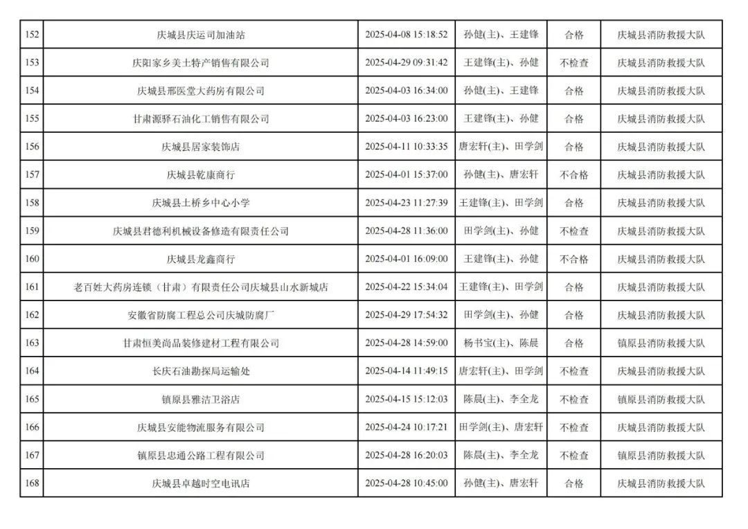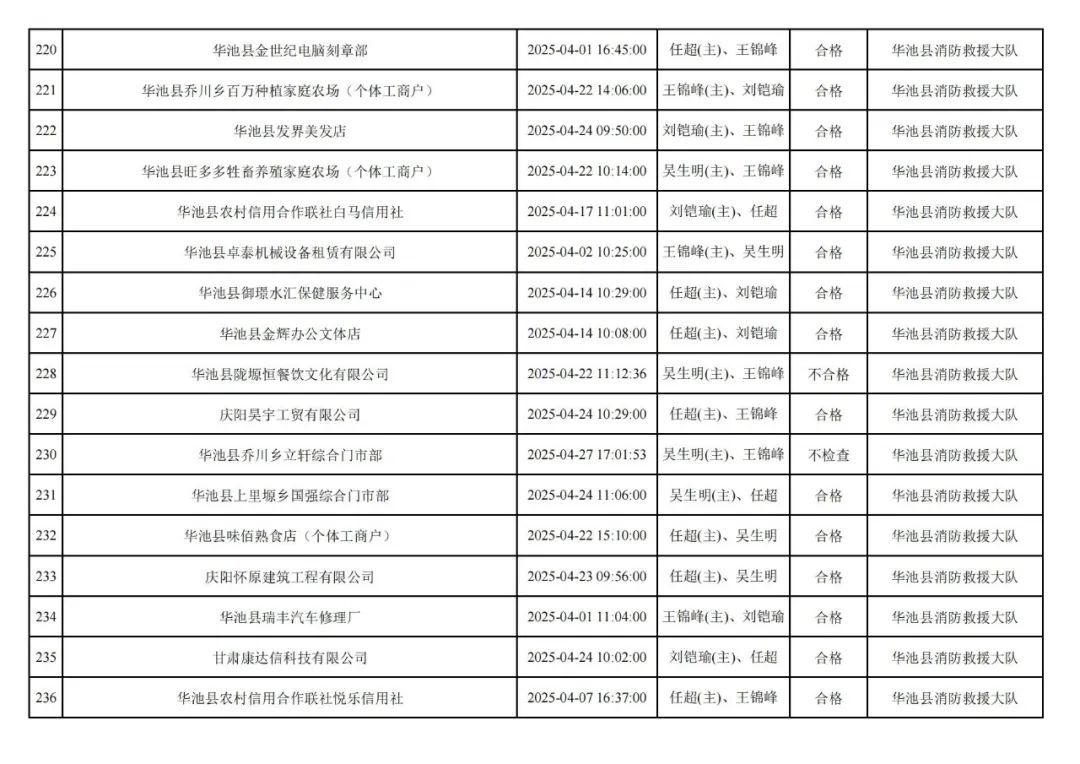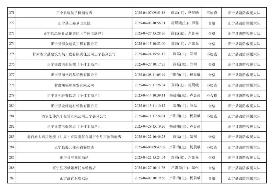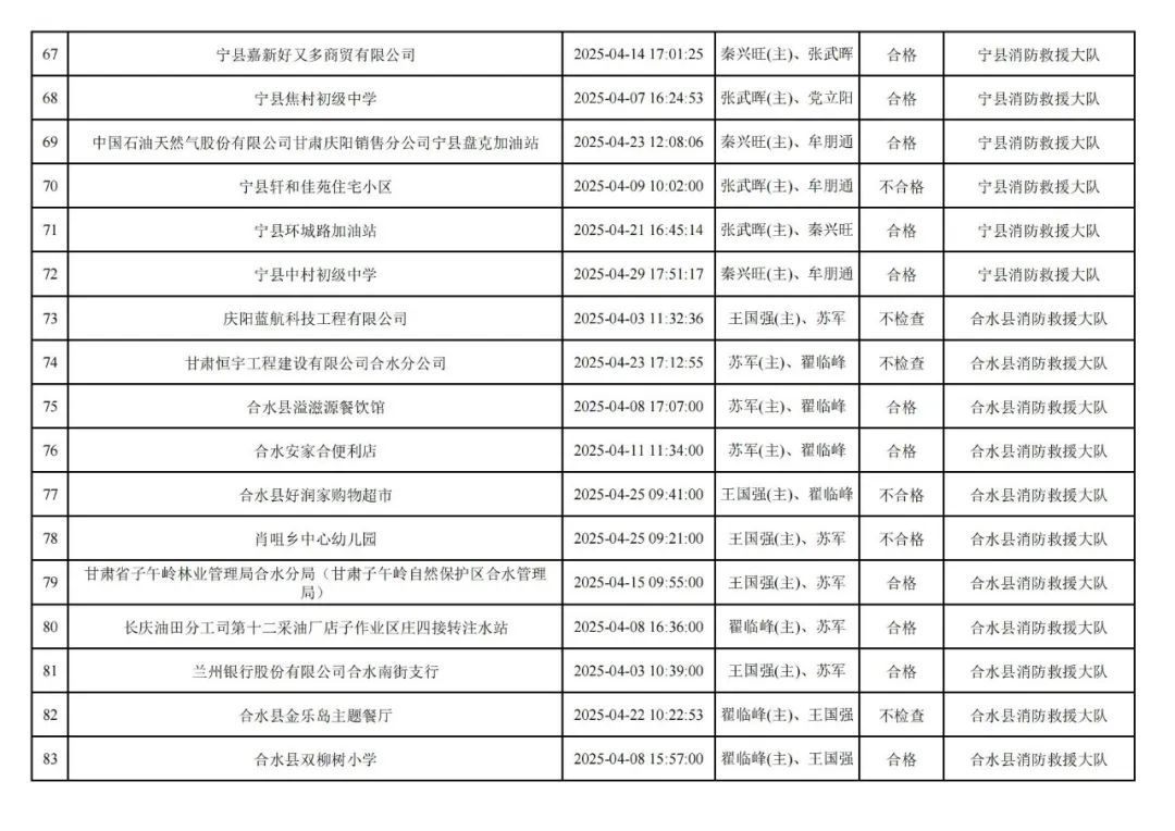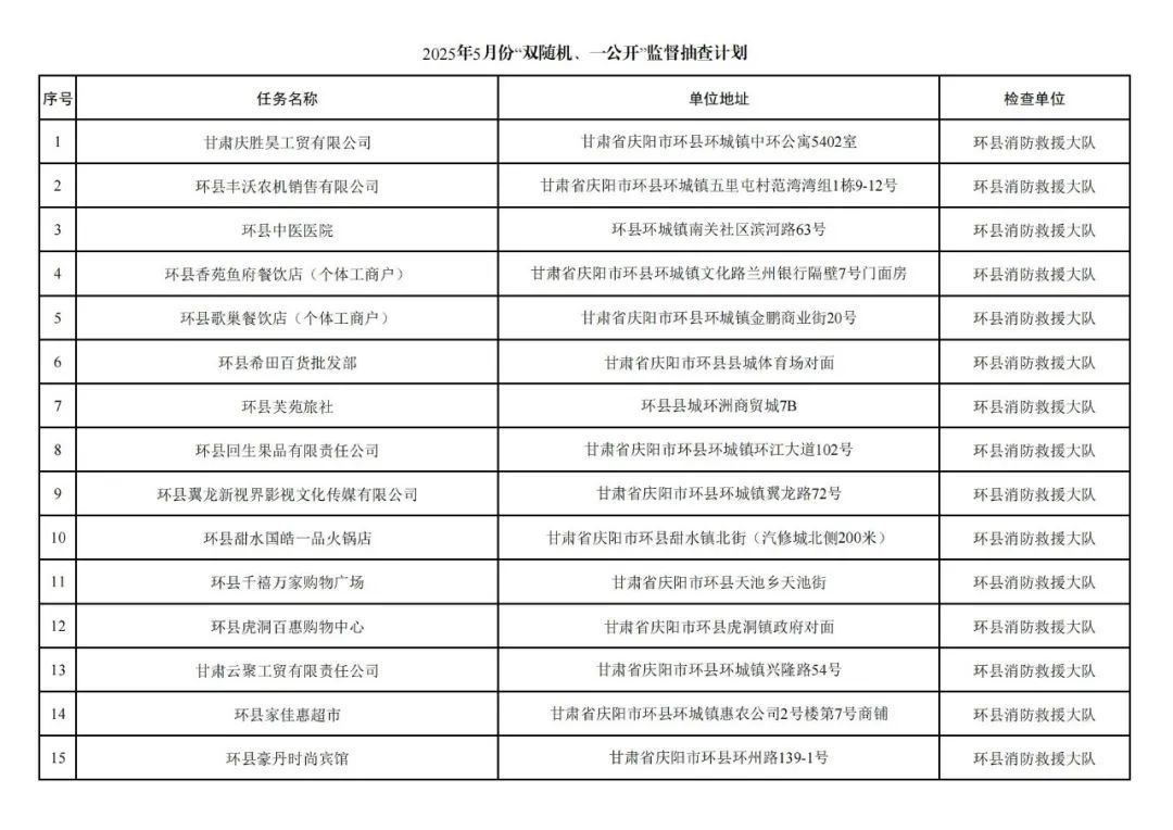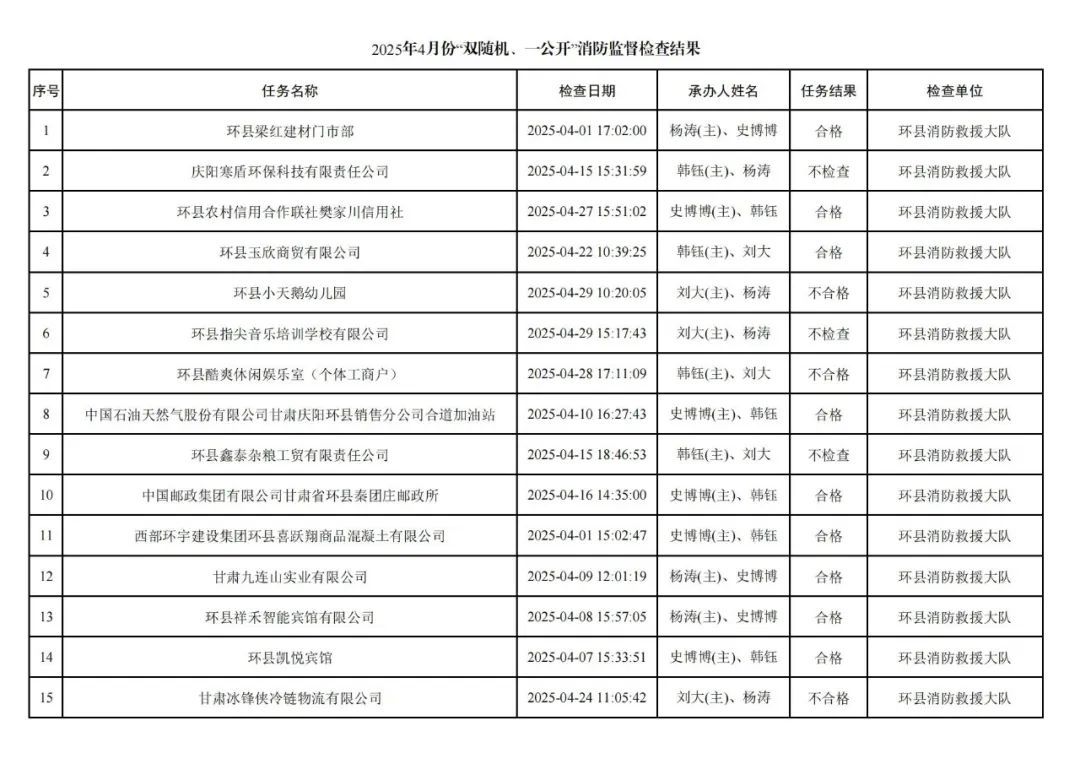 為貫徹落實(shí)《消防救援局關(guān)于全面推行“雙隨機(jī)、一公開”消防監(jiān)管工作的通知》(應(yīng)急消〔2019〕241號),認(rèn)真組織實(shí)施“雙隨機(jī)、一公開”消防監(jiān)管工作,現(xiàn)將2025年4月份“雙隨機(jī)、一公開”消防監(jiān)督檢查結(jié)果及2025年5月份監(jiān)督抽查計(jì)劃公示如下:
