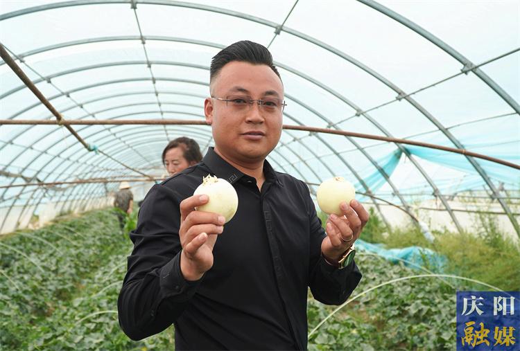 喬志龍在蒲河村甜瓜大棚展示成熟的甜瓜。