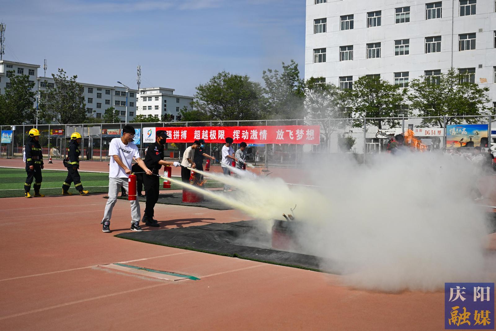 室外突發(fā)火情應(yīng)急演練,消防員、學(xué)院工作人員、師生協(xié)同滅火。