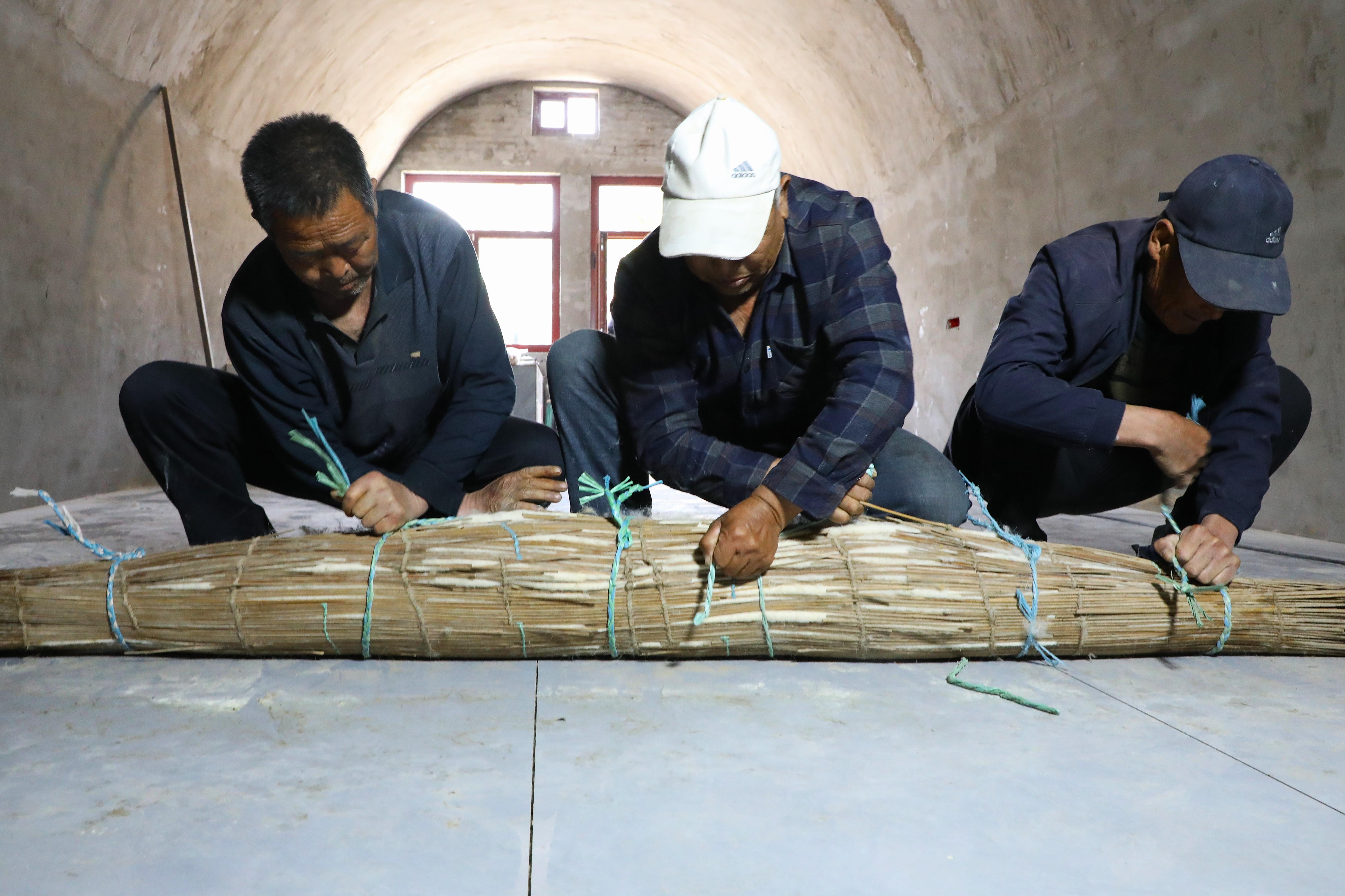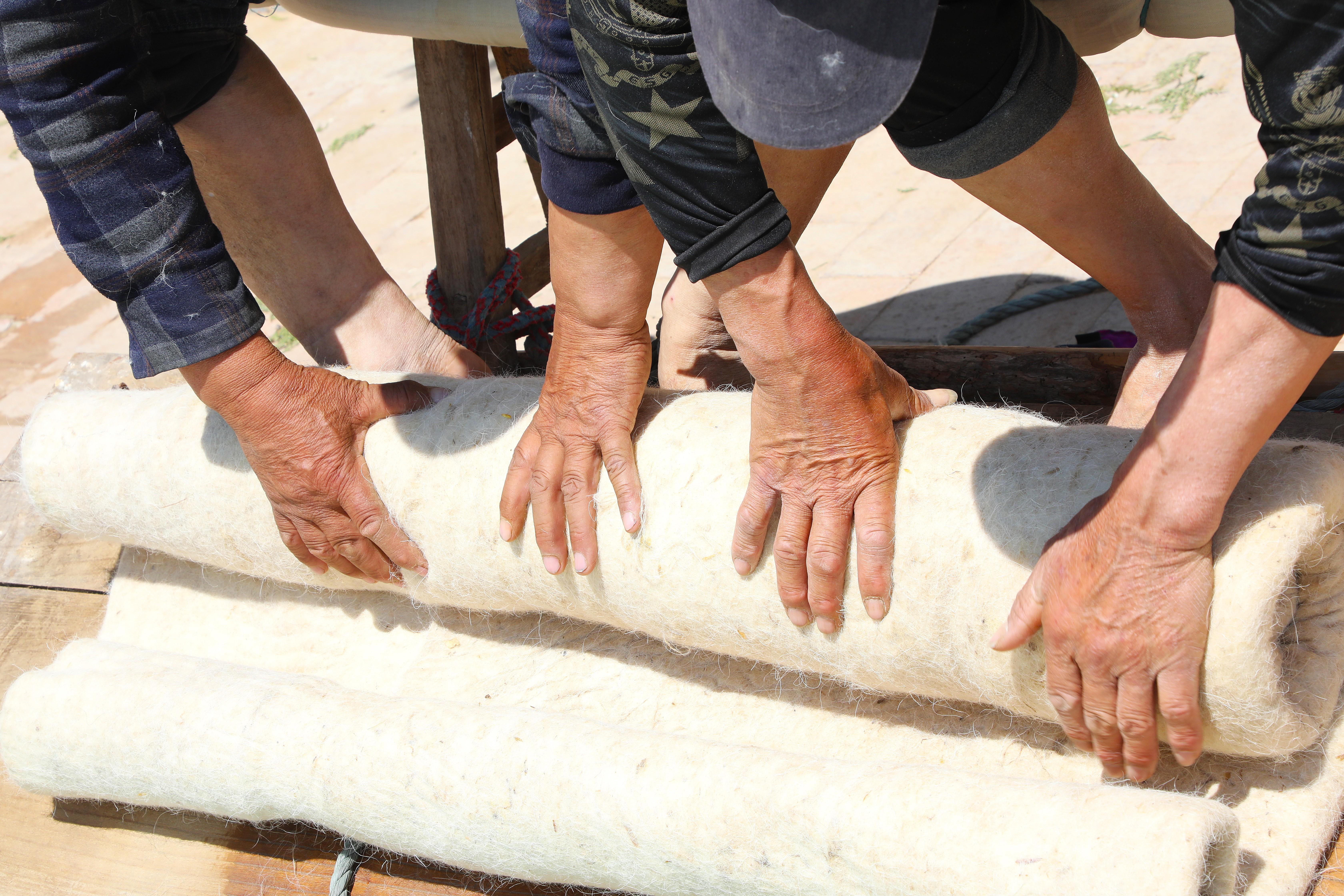 第八道卷簾,眾人合力將羊毛和簾子緊緊卷起,壓成毛坯,用繩子扎好,再用腳踢踏、滾動(dòng)卷簾。
