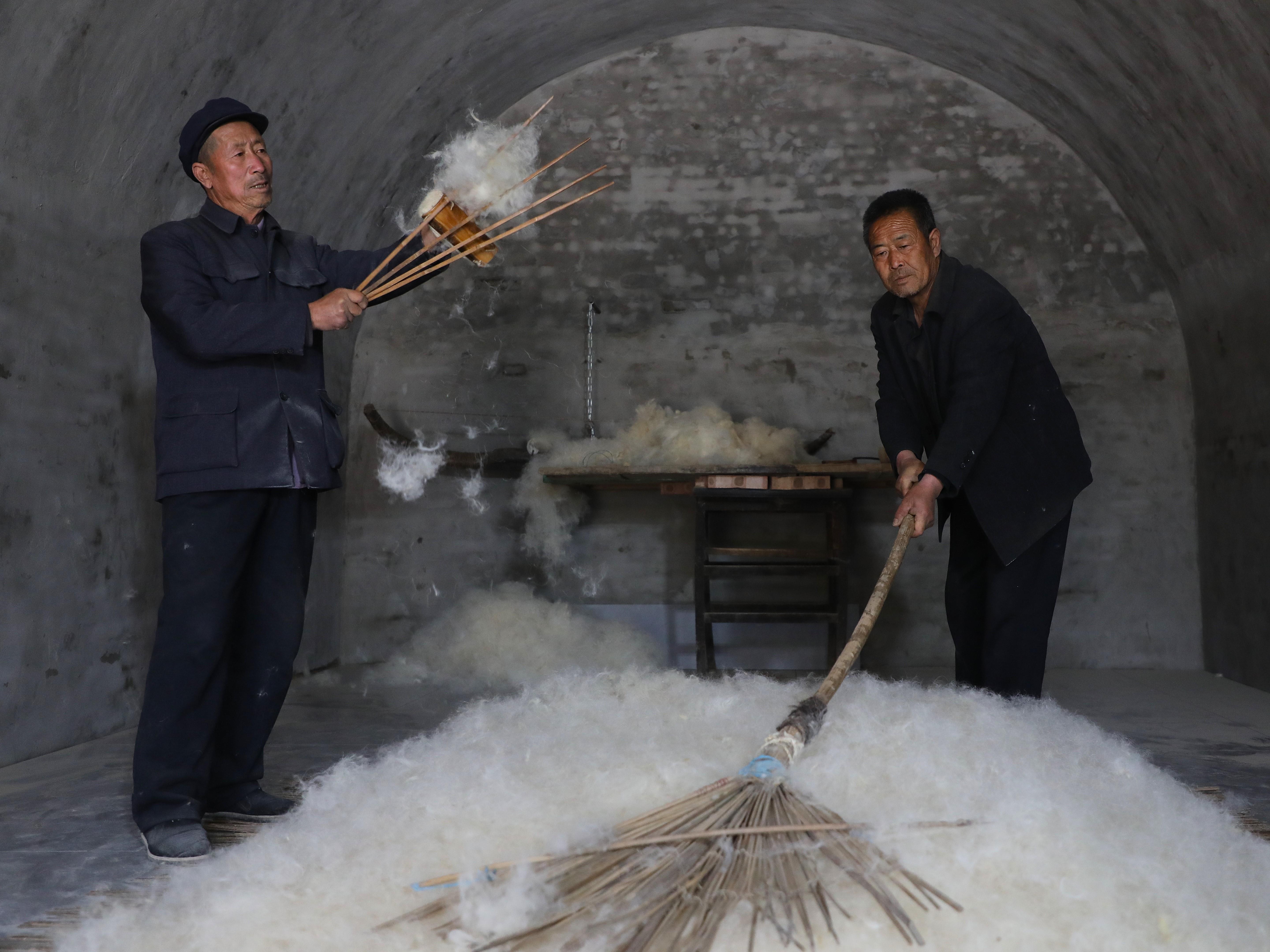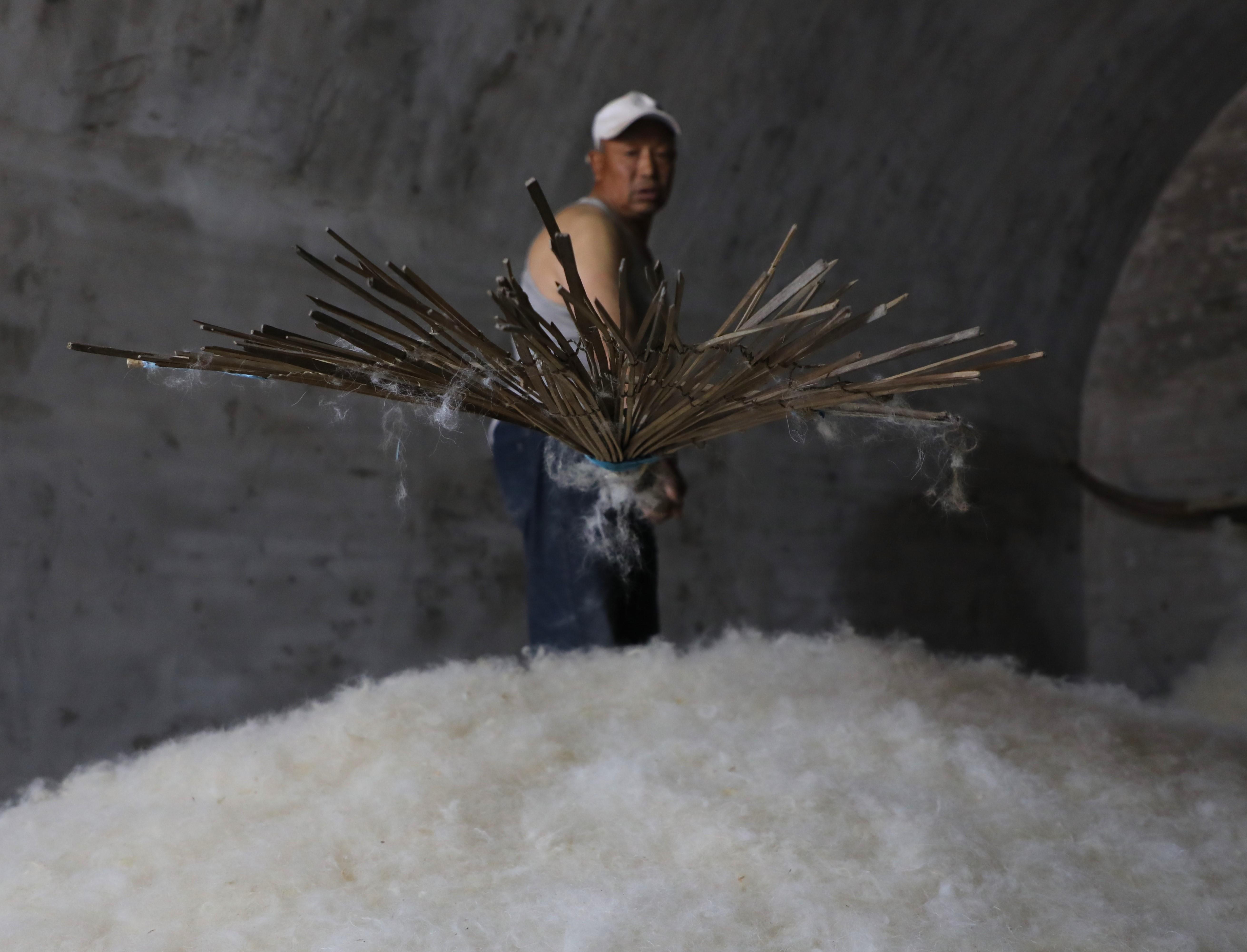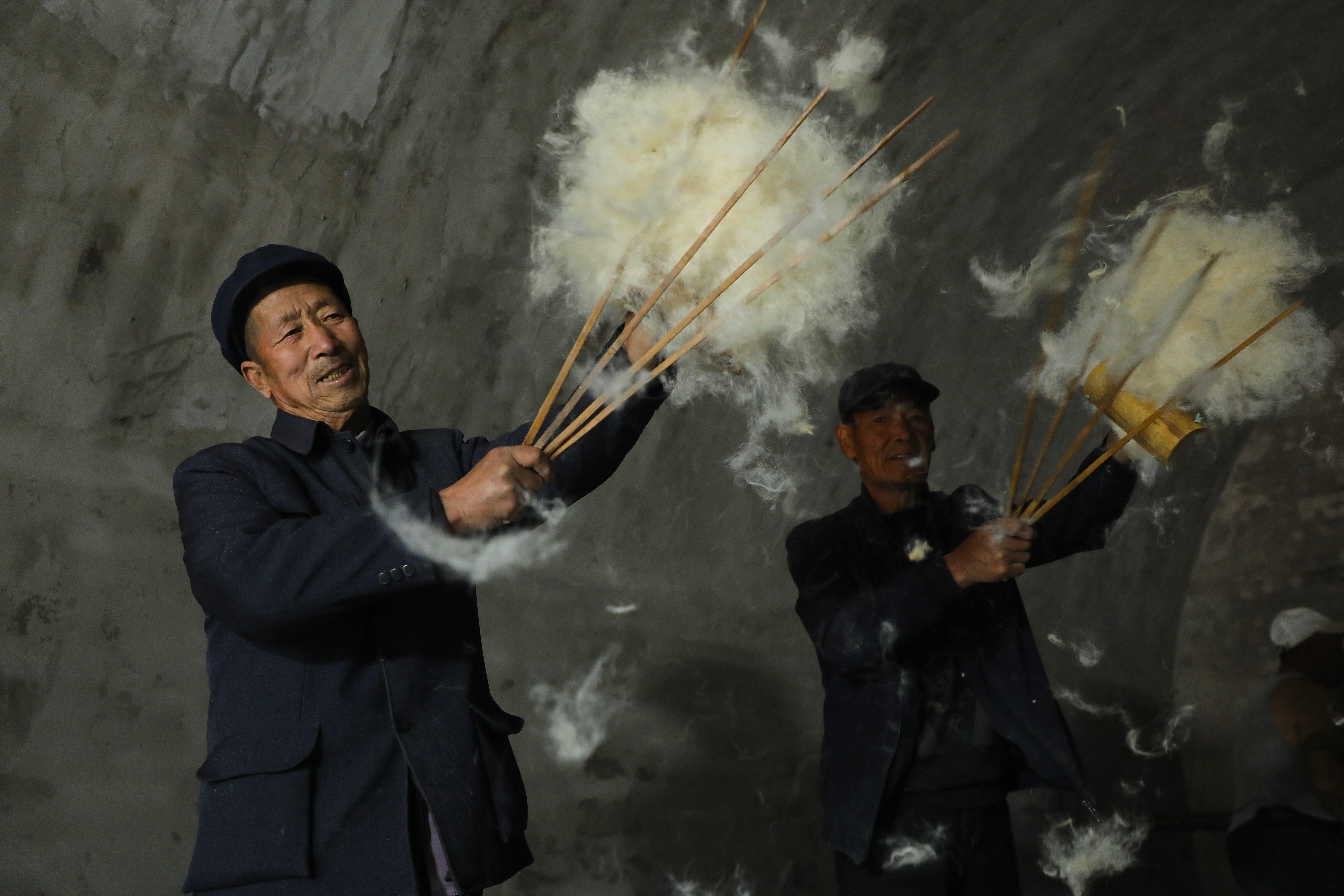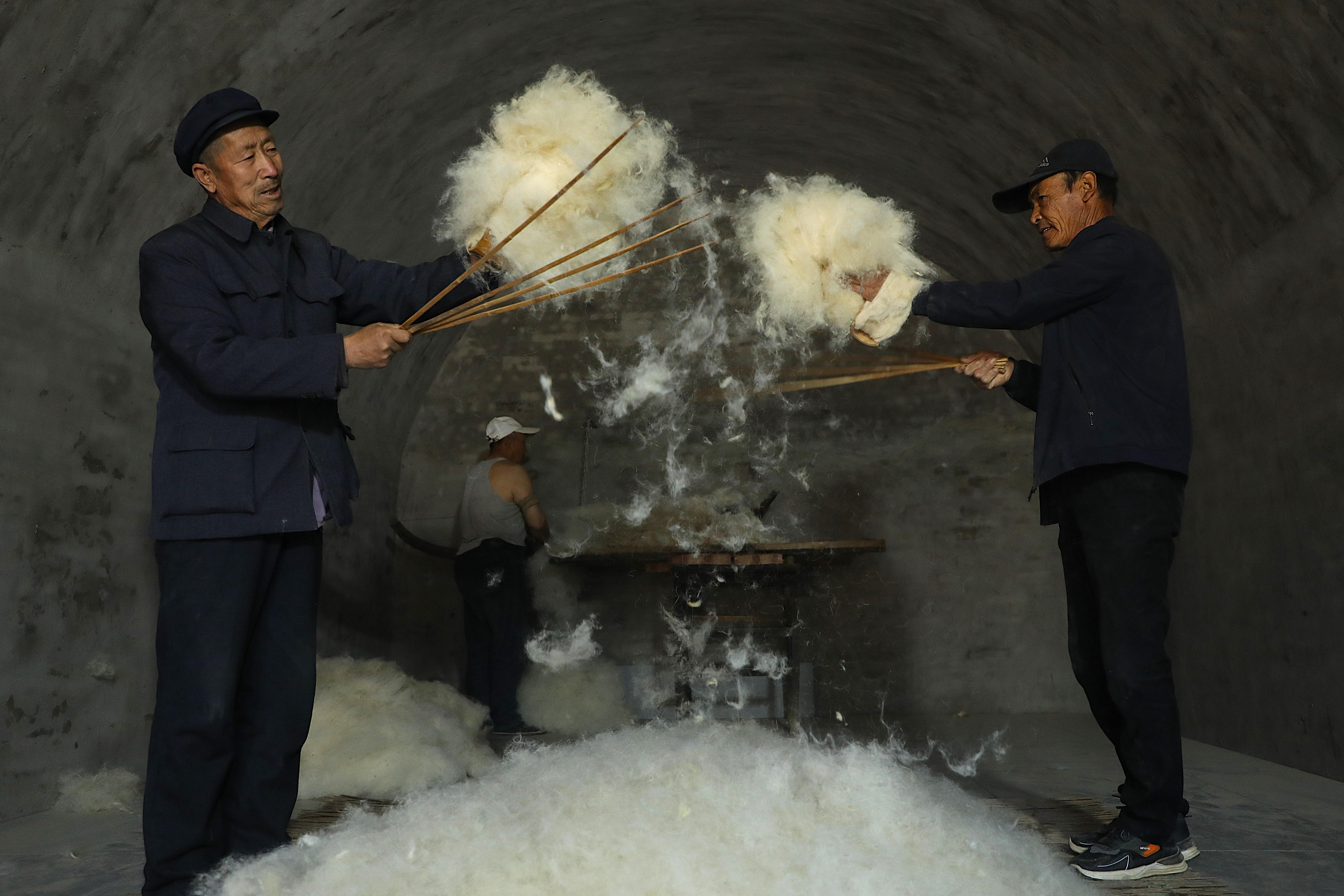隨著弓弦顫動(dòng),“砰砰”聲中,羊毛如雪花般散開,變得蓬松輕盈。