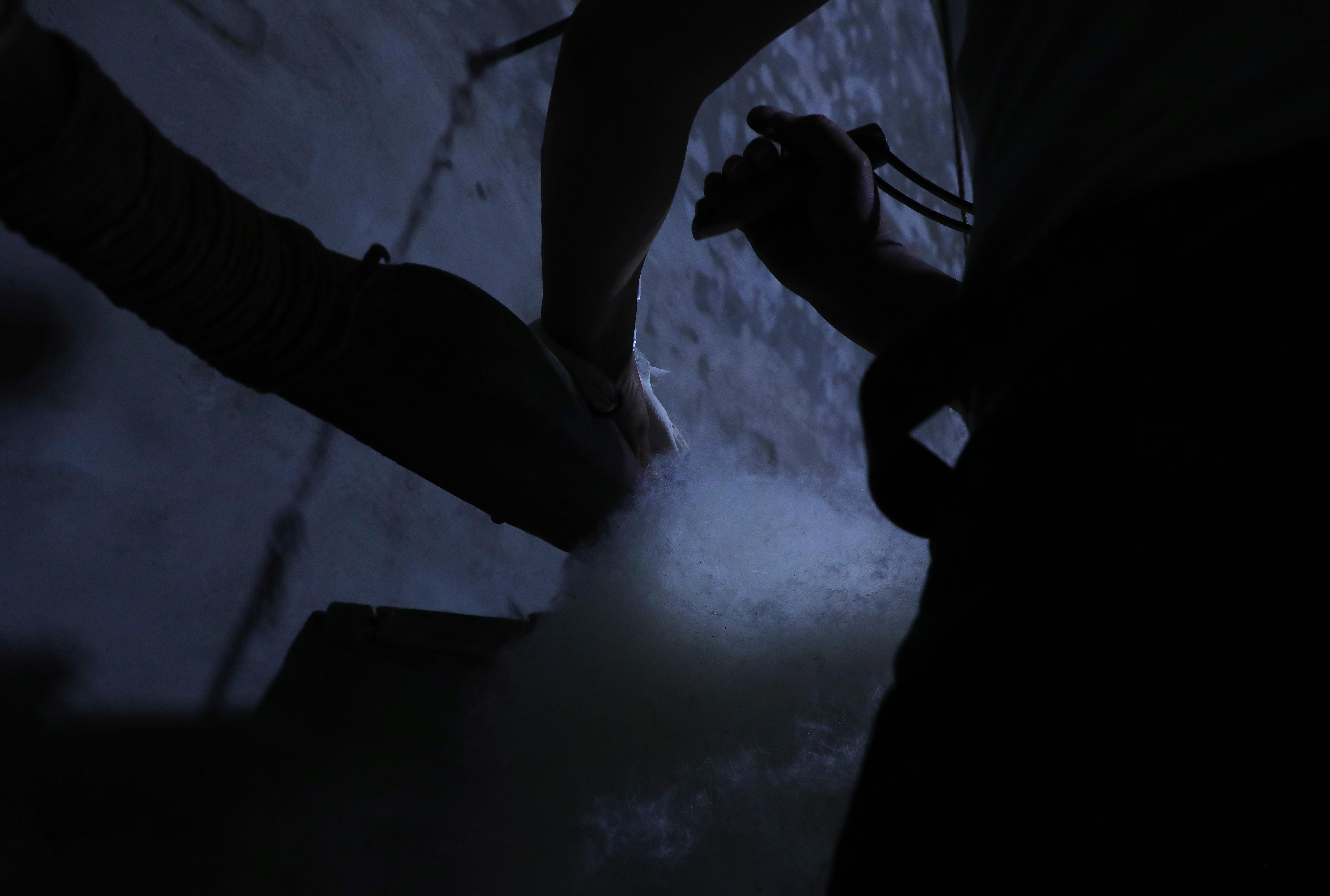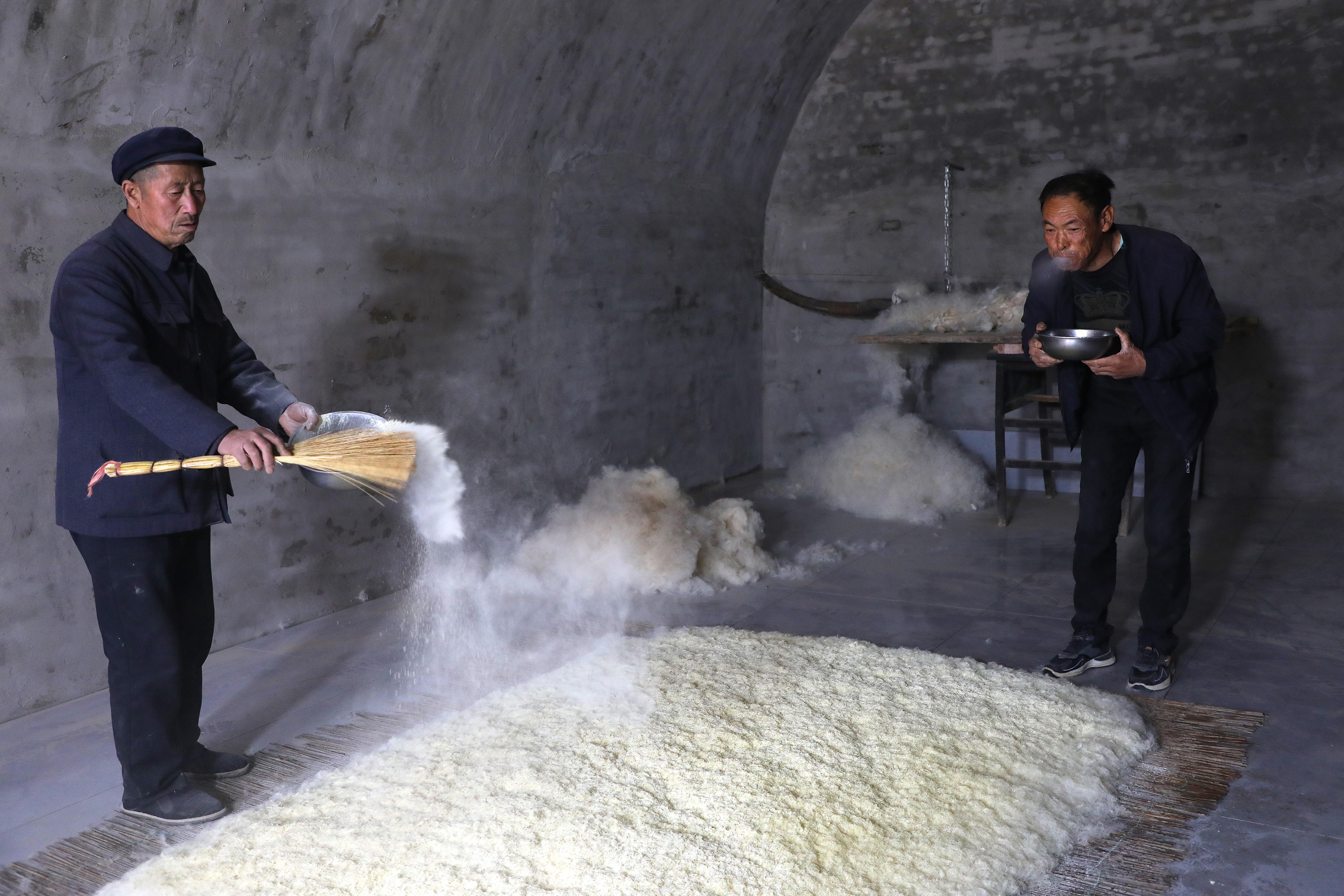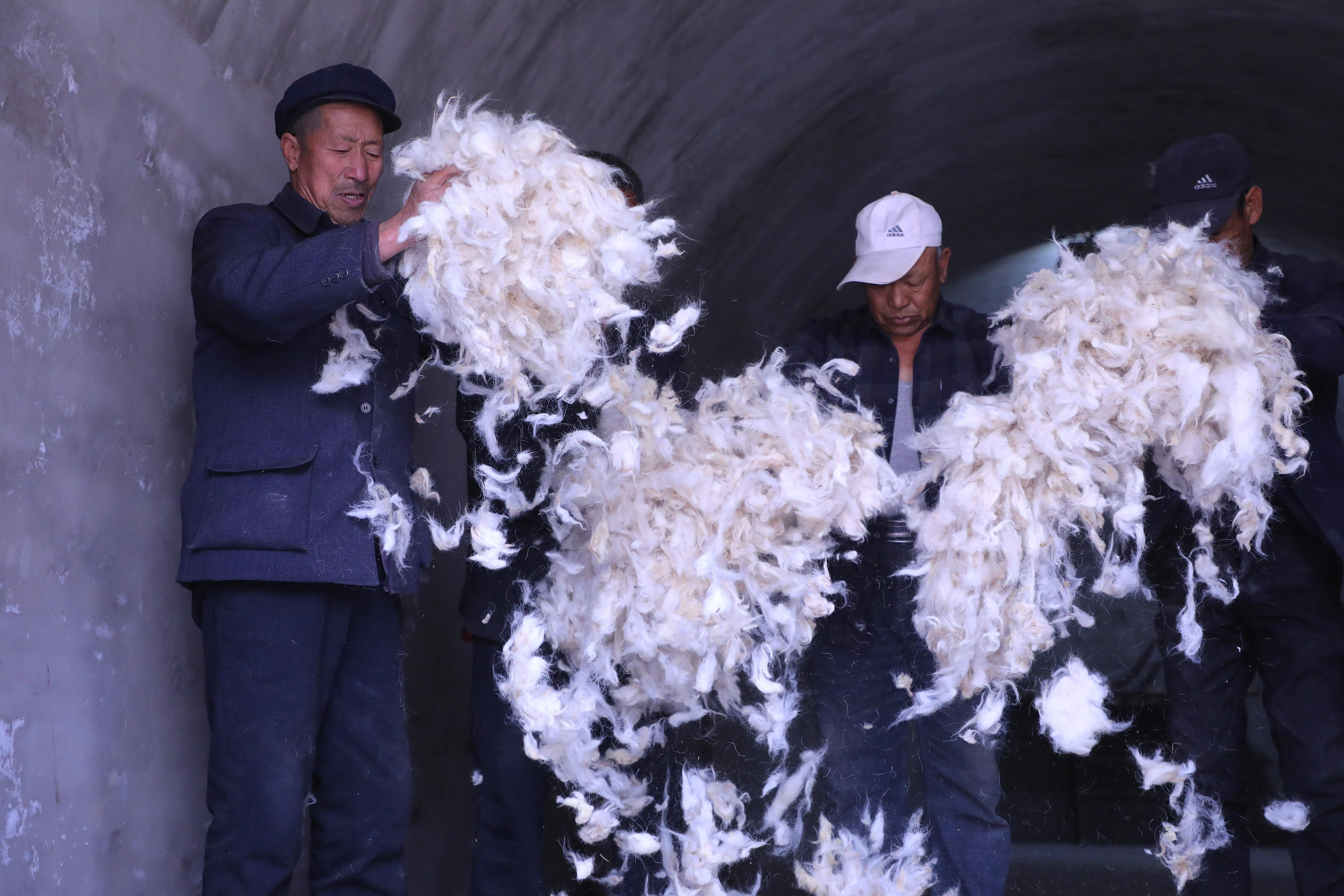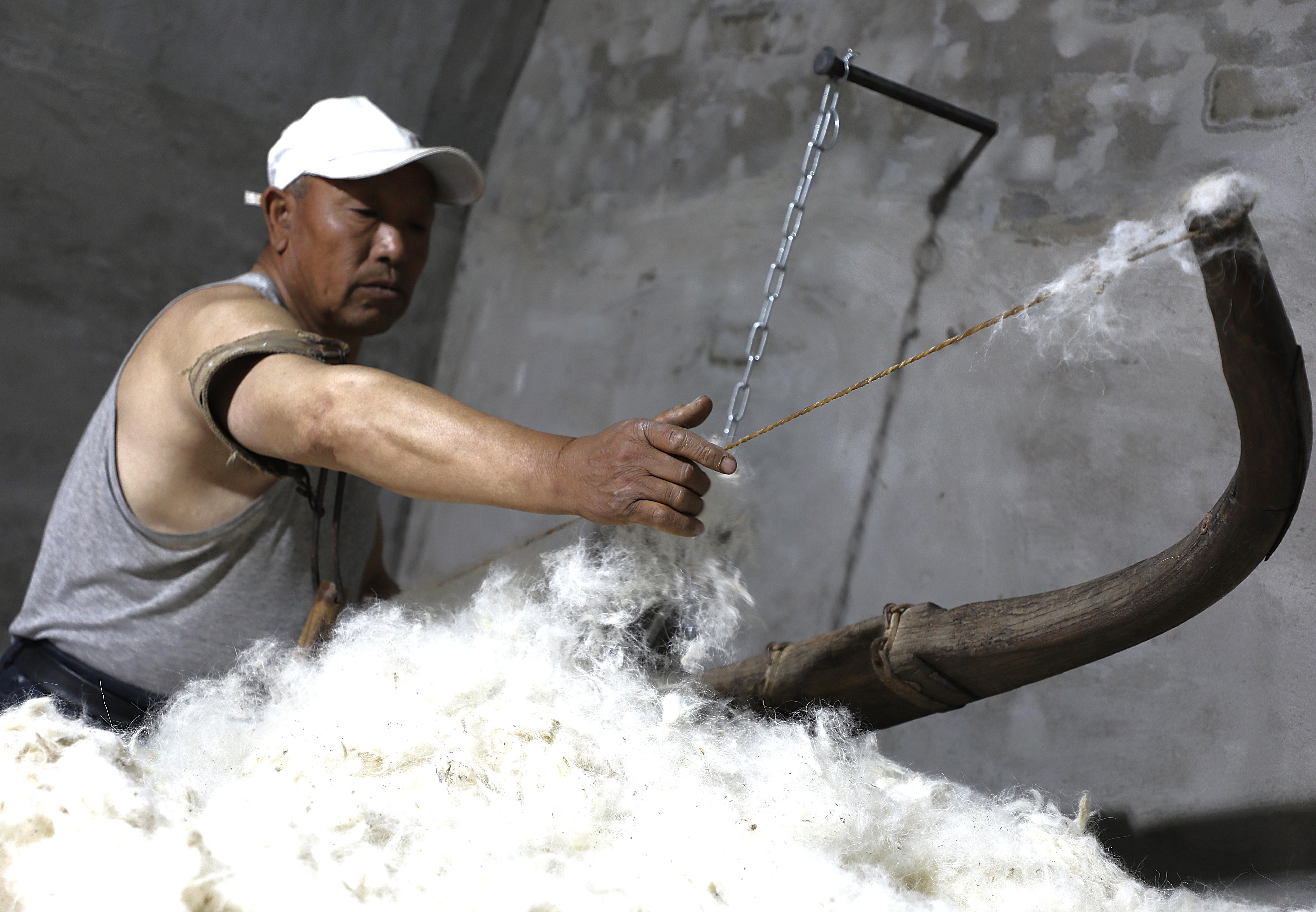 隨著弓弦顫動(dòng),“砰砰”聲中,羊毛如雪花般散開,變得蓬松輕盈。