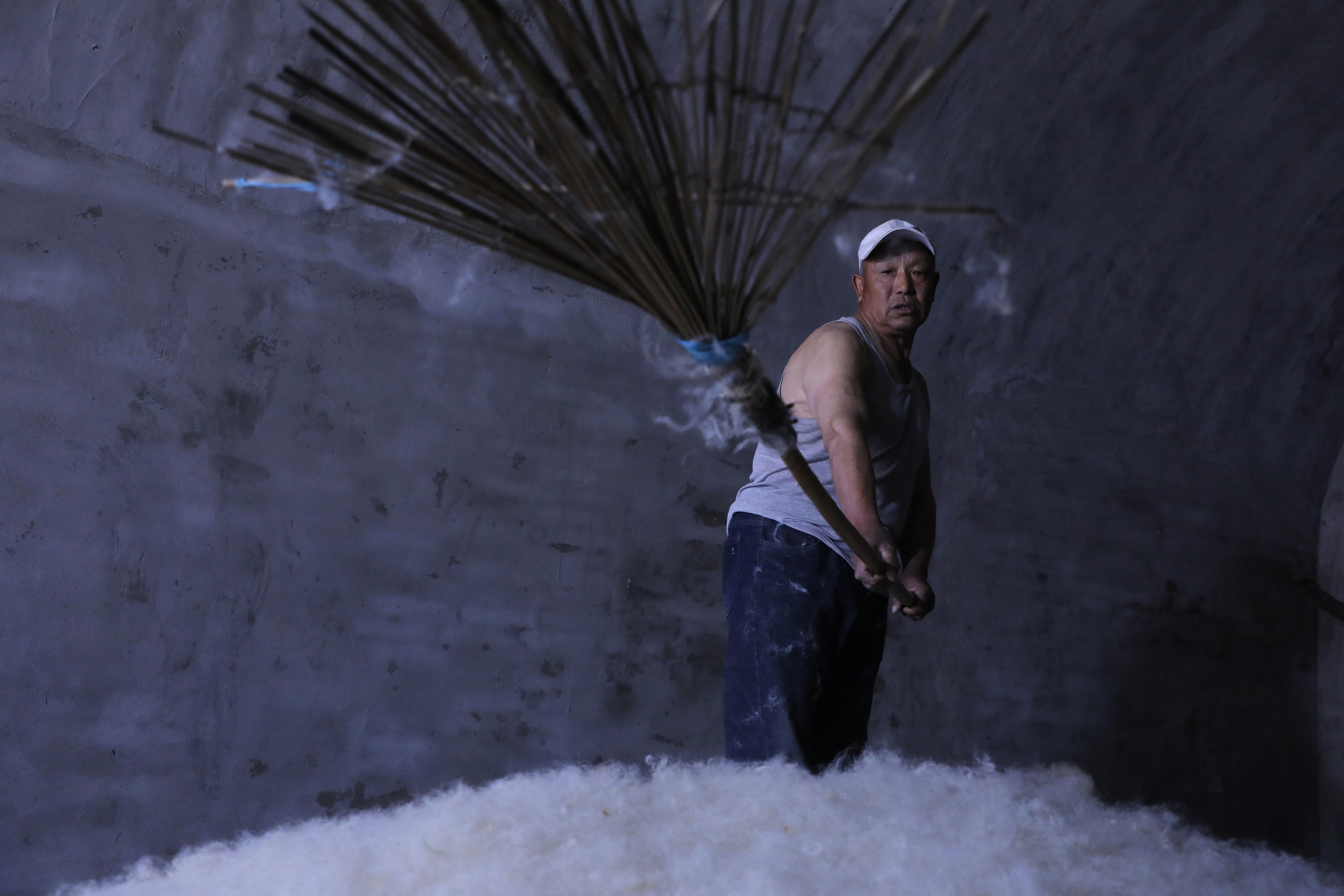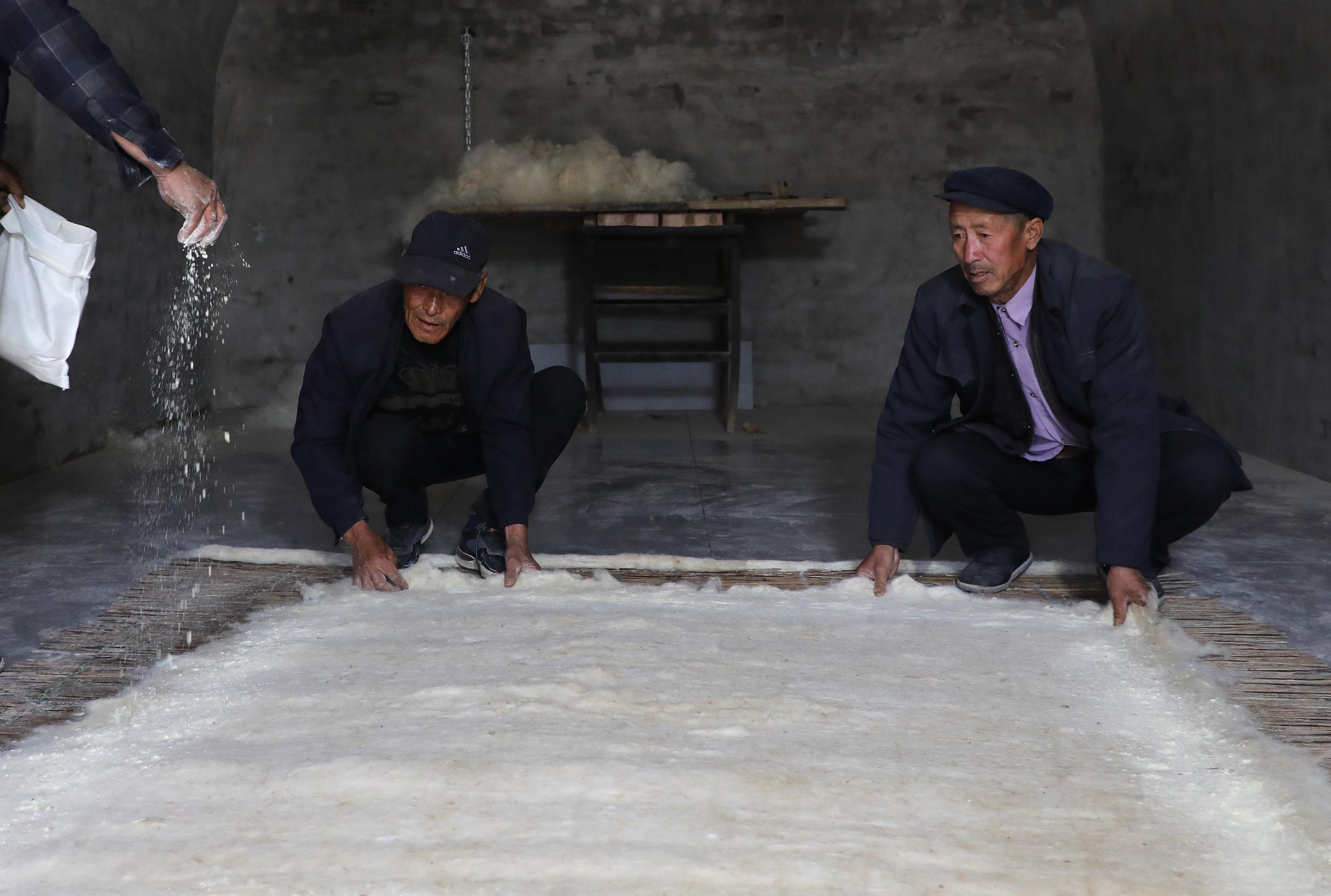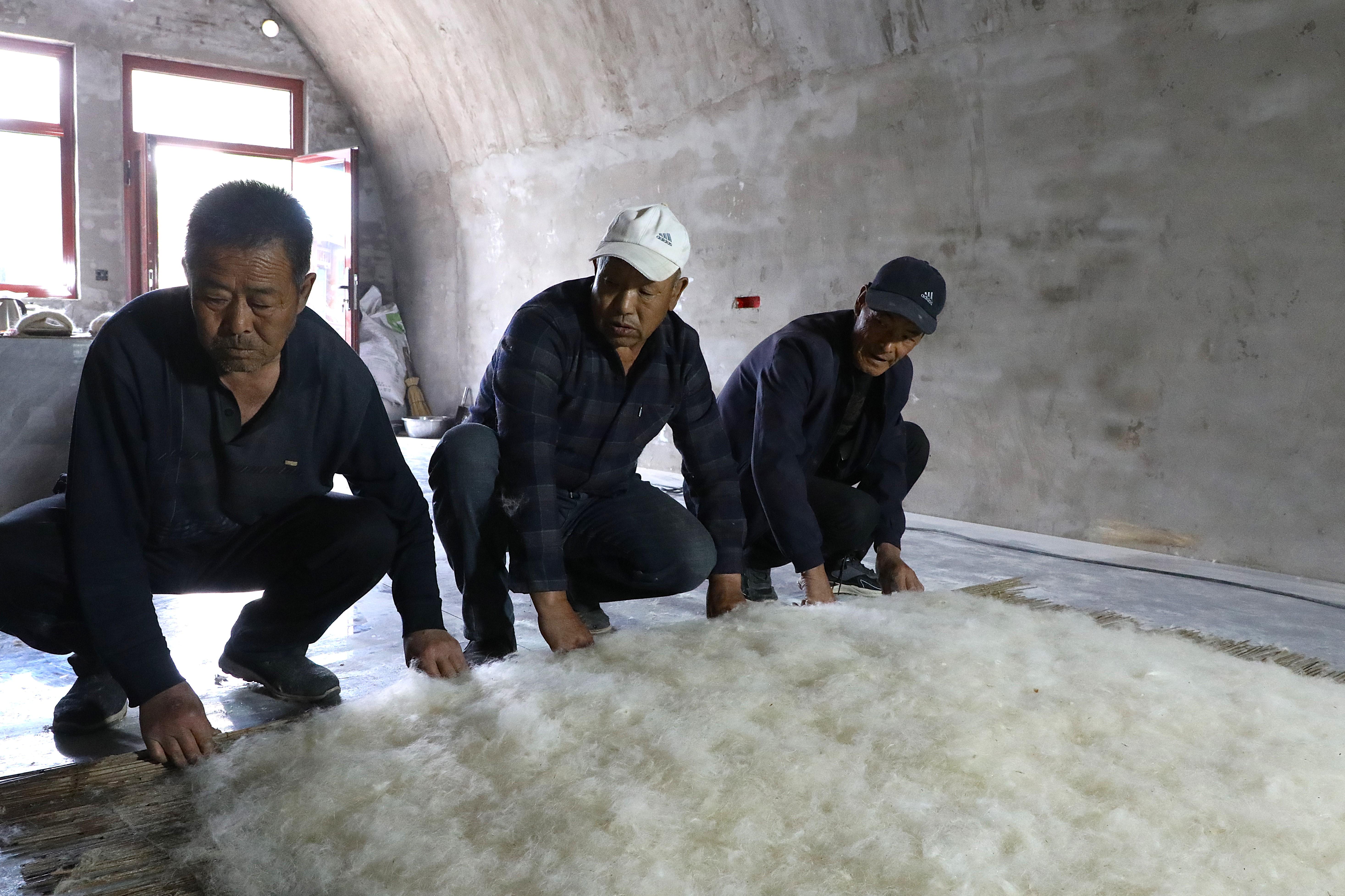 第三道工序是鋪毛,把白如棉絮的羊毛均勻鋪在提前備好的氈簾上。