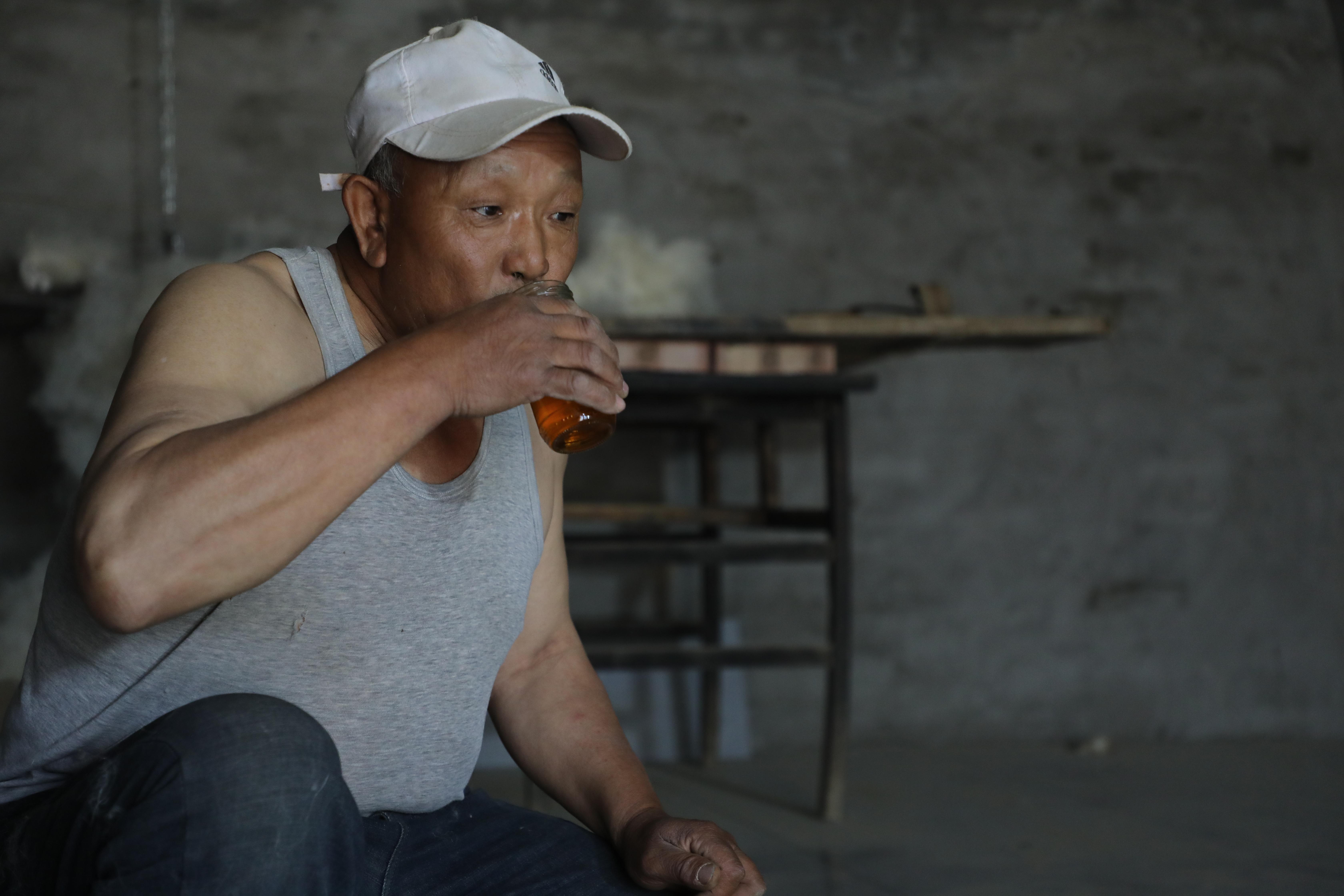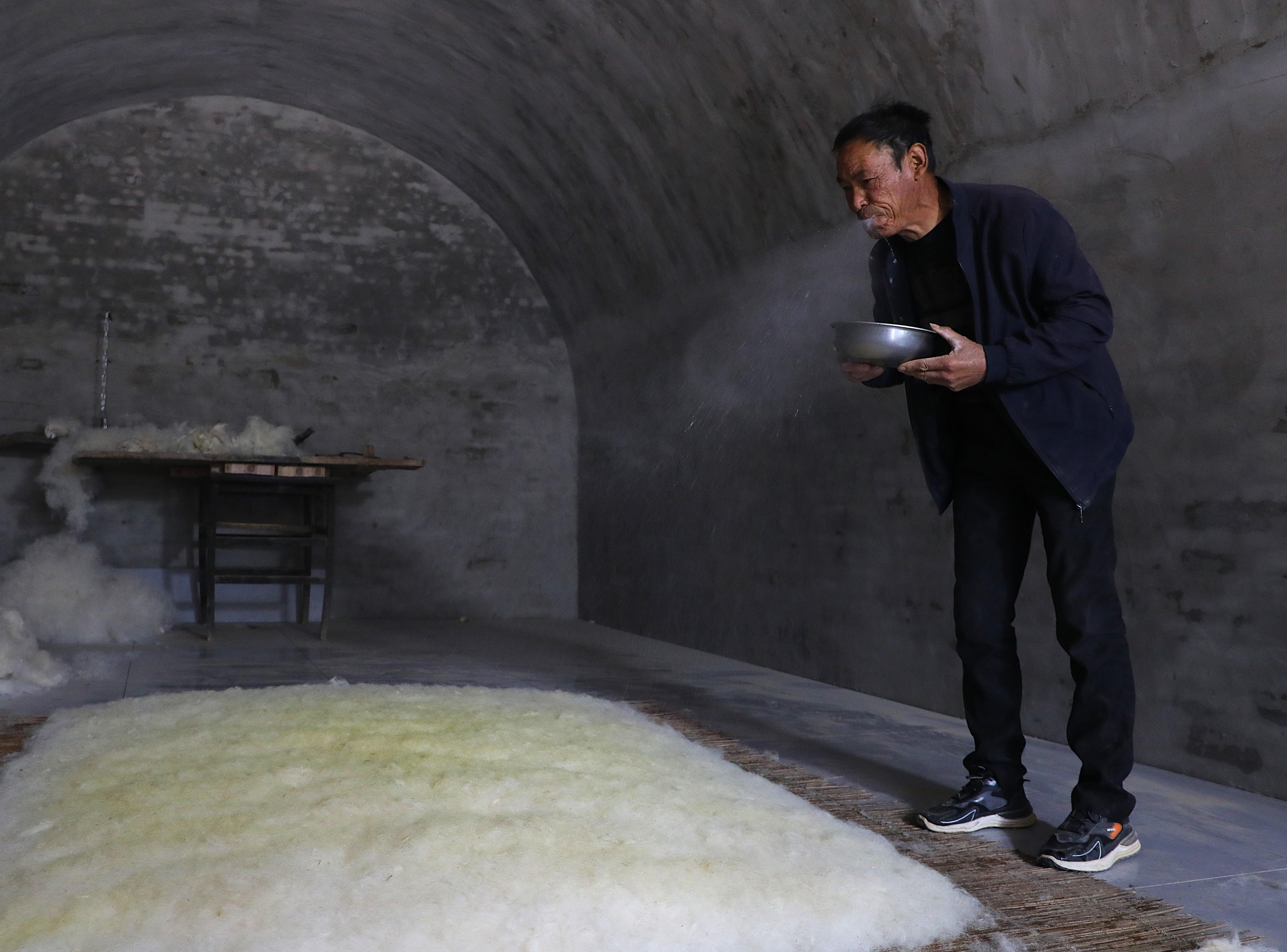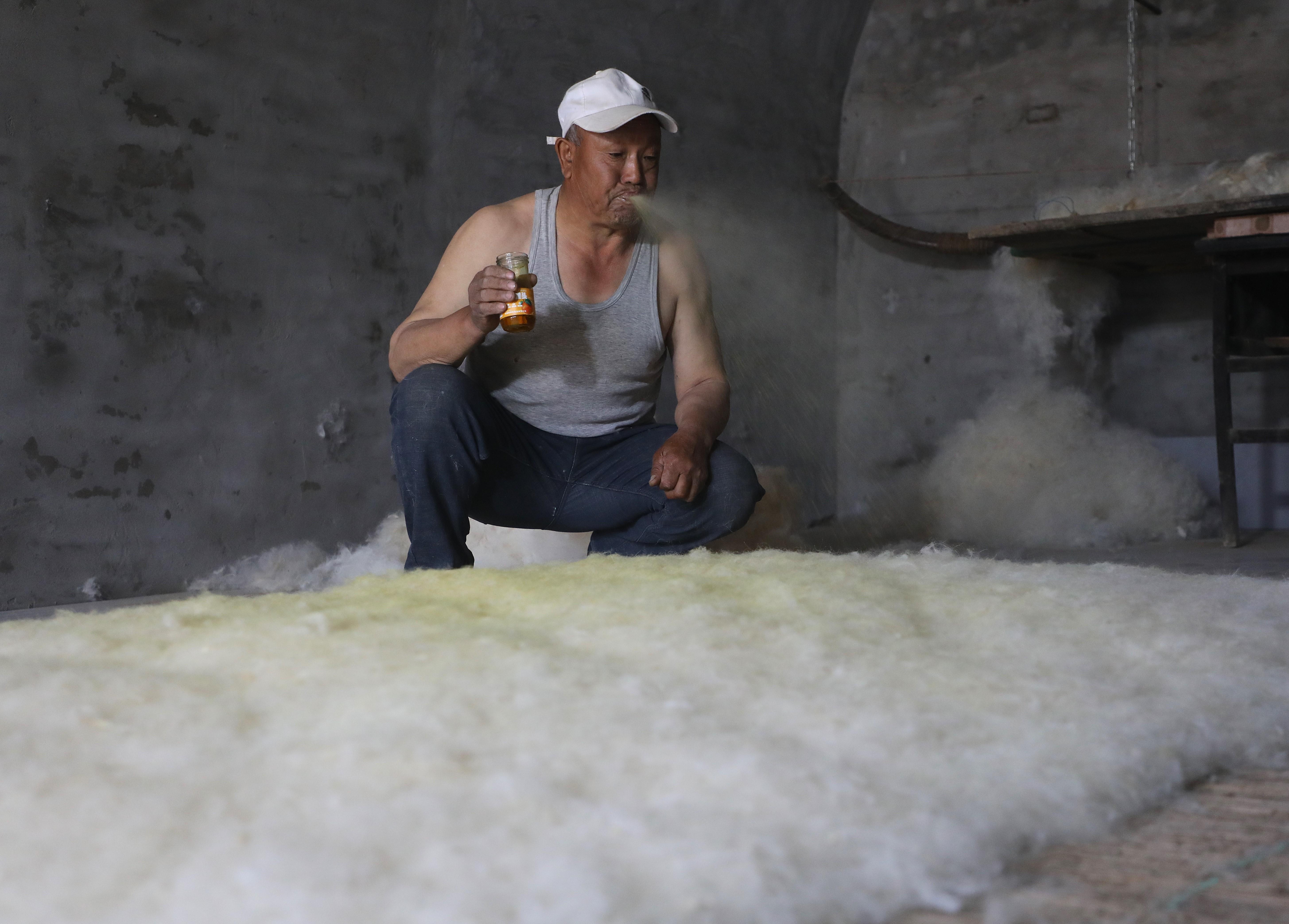 第五道噴油,匠人將滿碗清油噙在口中,均勻噴灑在羊毛上。