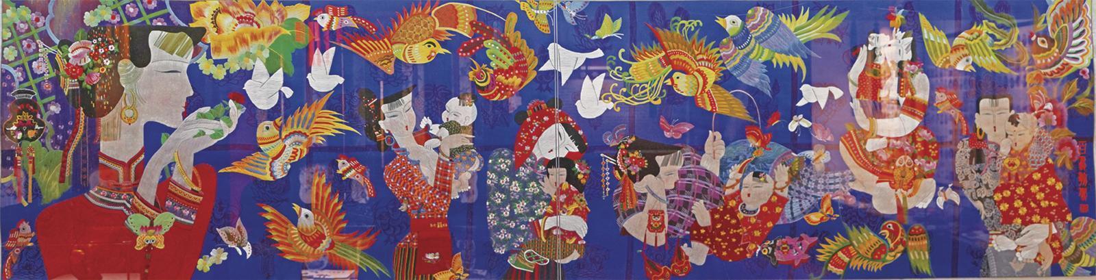 《百鳥朝鳳》這件刺繡作品以裝飾畫的形式,用傳統(tǒng)民間刺繡表現(xiàn)手法,以深藍為底色,襯托剪紙窗花背景,聚集了慶陽虎頭鞋、針扎、雙魚枕、福娃、圍裙、窗花、香包、“五毒”掛件等豐富的民間傳統(tǒng)藝術(shù)元素,寓意深厚,氣勢恢宏,人物逼真,形象夸張,栩栩如生,深情贊頌中國婦女勤儉節(jié)約、無私奉獻的傳統(tǒng)美德。