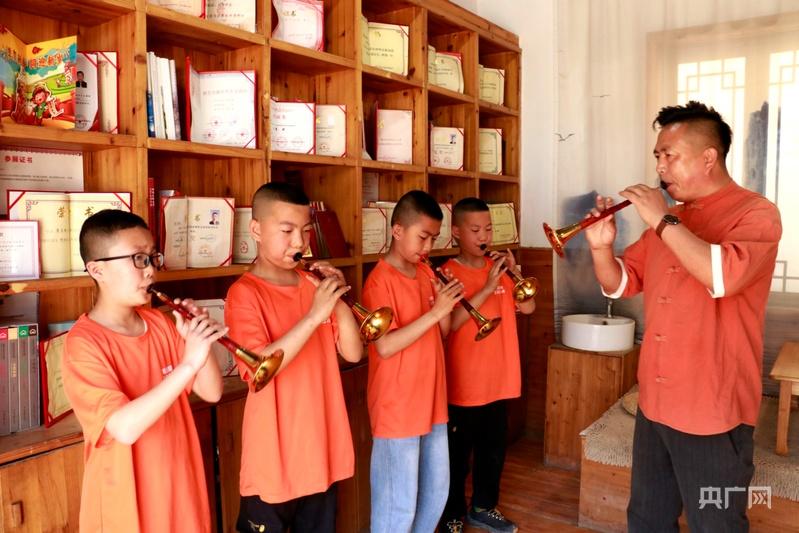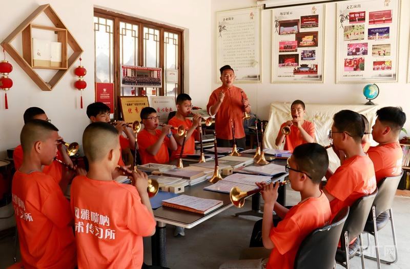 翟立鵬正在帶領(lǐng)徒弟練習(xí)嗩吶(央廣網(wǎng)發(fā) 耿洋洋 攝)