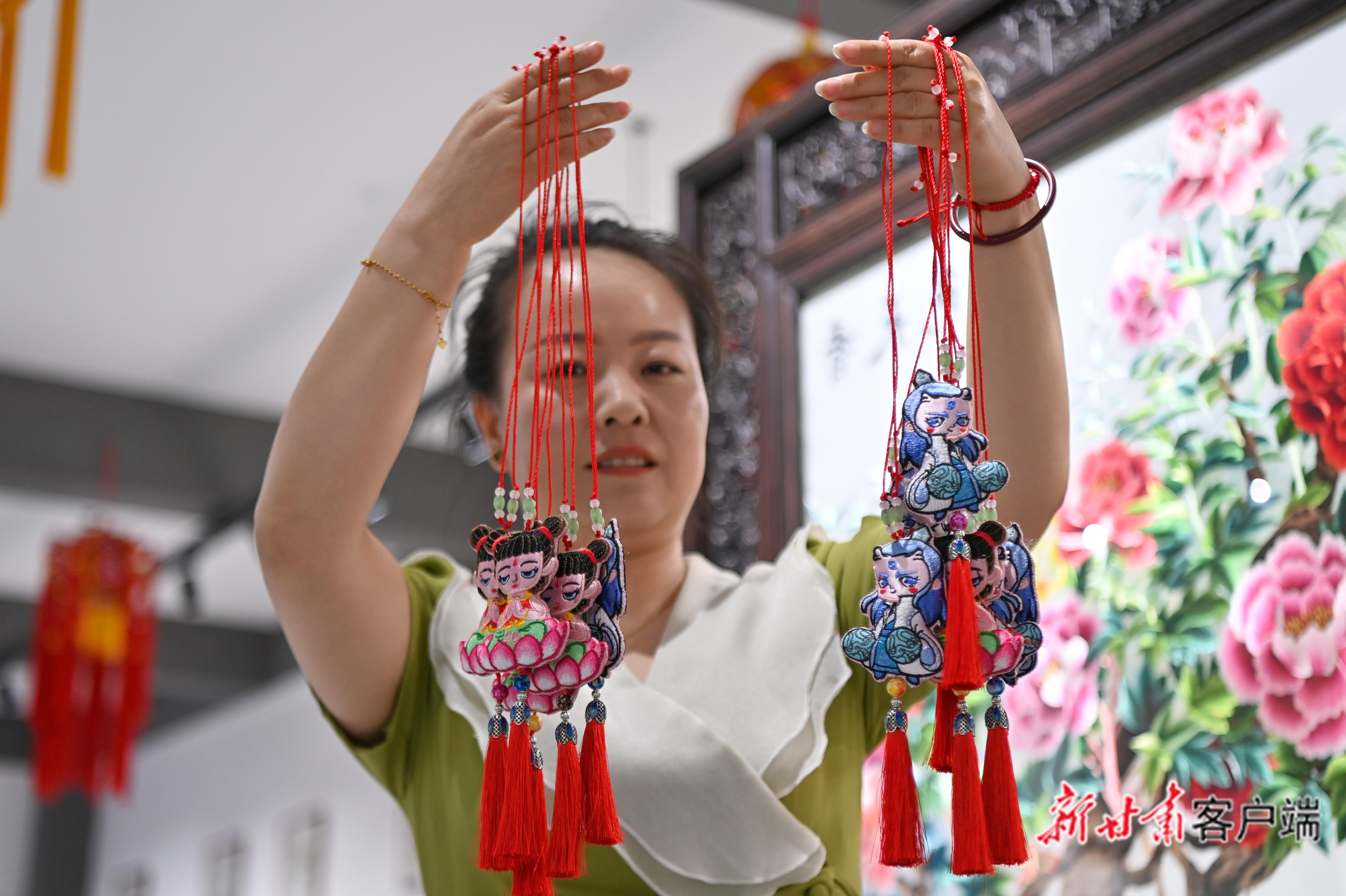 “您看這哪吒紋樣,是從最近火熱的電影作品上提取的元素。”在繡品陳列館里,既有登上巴黎時(shí)裝周、充滿科技感的AR交互香包,也有帶著泥土芬芳、充滿鄉(xiāng)土氣息的百家布老虎,傳統(tǒng)與現(xiàn)代在此交叉著,見(jiàn)證傳統(tǒng)技藝的傳承與創(chuàng)新,這些作品將隴東女子的巧思與智慧,繡進(jìn)世界的瞳孔,讓世界領(lǐng)略慶陽(yáng)香包的獨(dú)特魅力。