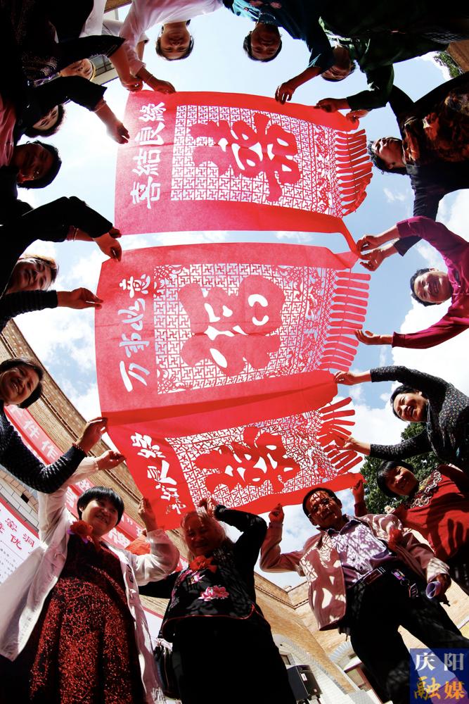 慶陽剪紙傳承人展示巨幅剪紙作品,喜迎節(jié)會。慶陽融媒記者 趙彩霞 攝