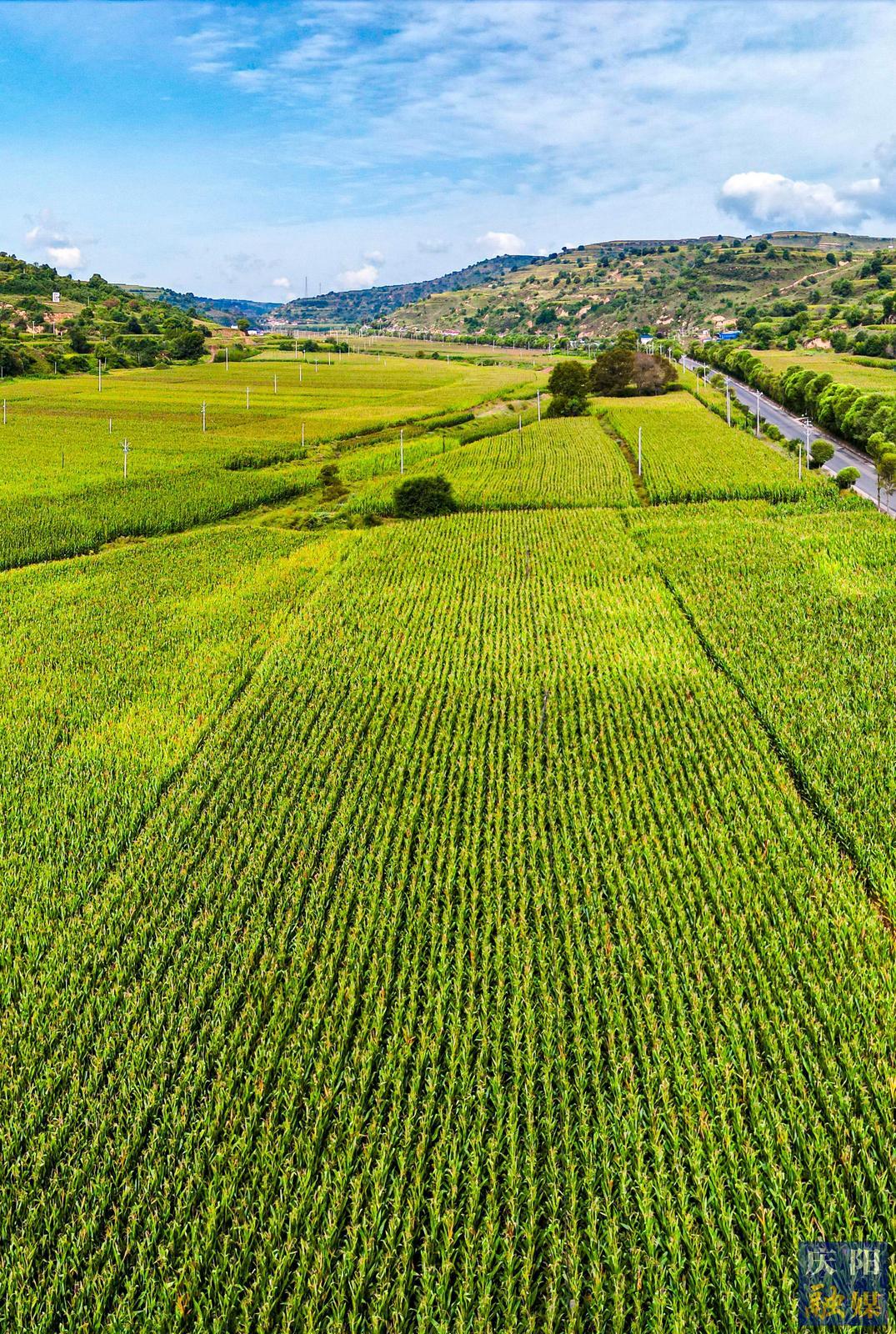俯瞰華池縣二將川萬畝玉米高標(biāo)準(zhǔn)農(nóng)田保護(hù)區(qū)。慶陽融媒記者 俄少飛 攝