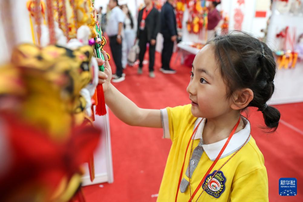 5月29日,小朋友在慶陽香包民俗文化節(jié)非遺沉浸體驗區(qū)挑選香包。新華社記者 郎兵兵 攝