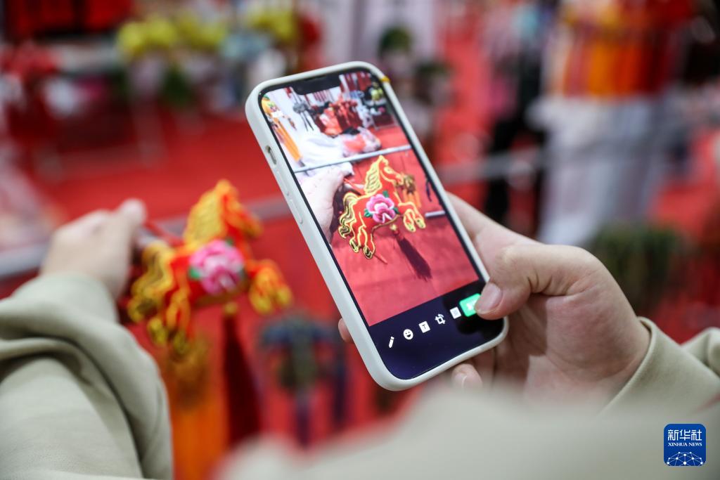 5月29日,市民在慶陽香包民俗文化節(jié)非遺沉浸體驗區(qū)拍攝生肖“馬”香包。新華社記者 郎兵兵 攝