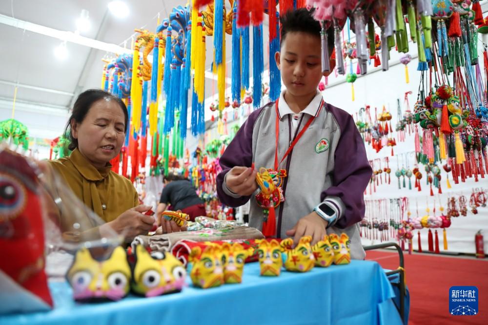 5月29日,在慶陽香包民俗文化節(jié)非遺沉浸體驗區(qū),一名學生放學后幫忙整理自家攤位上的香包。新華社記者 郎兵兵 攝