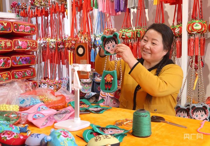 慶陽香包傳承人董利紅通過直播推介香包(央廣網(wǎng)發(fā) 盤小美 攝)