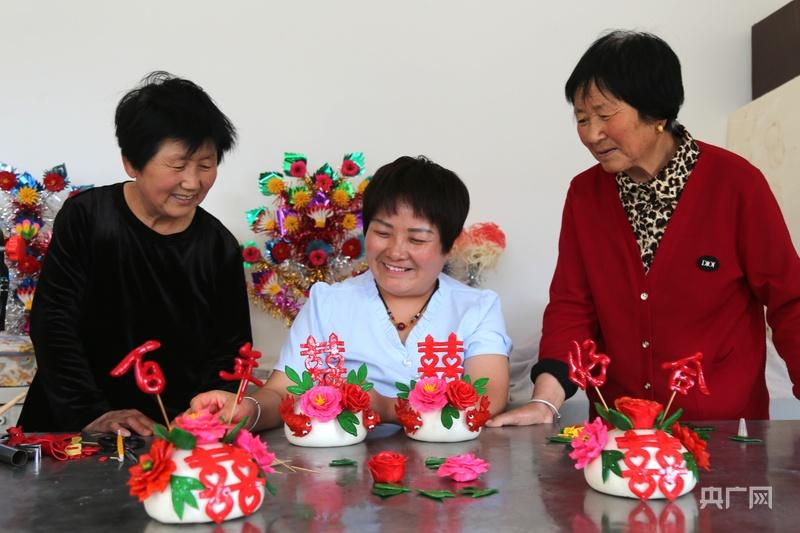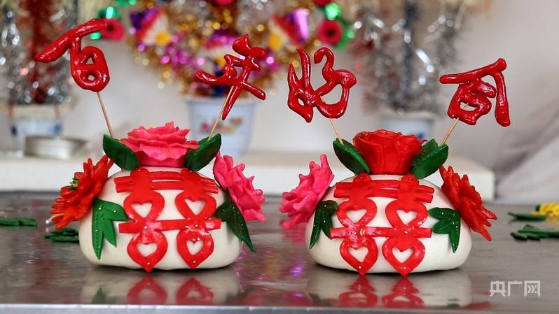 西峰區(qū)新橋村村民觀賞朱亞玲做的喜饃(央廣網發(fā) 盤小美 攝)