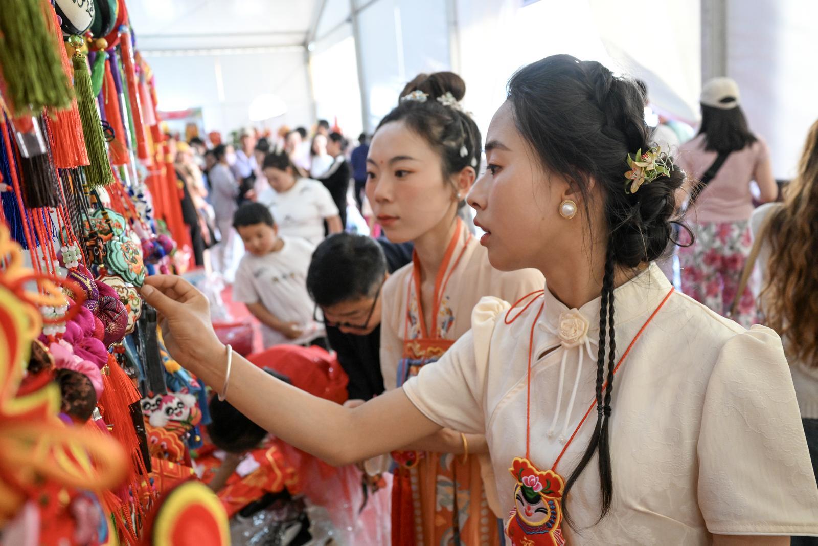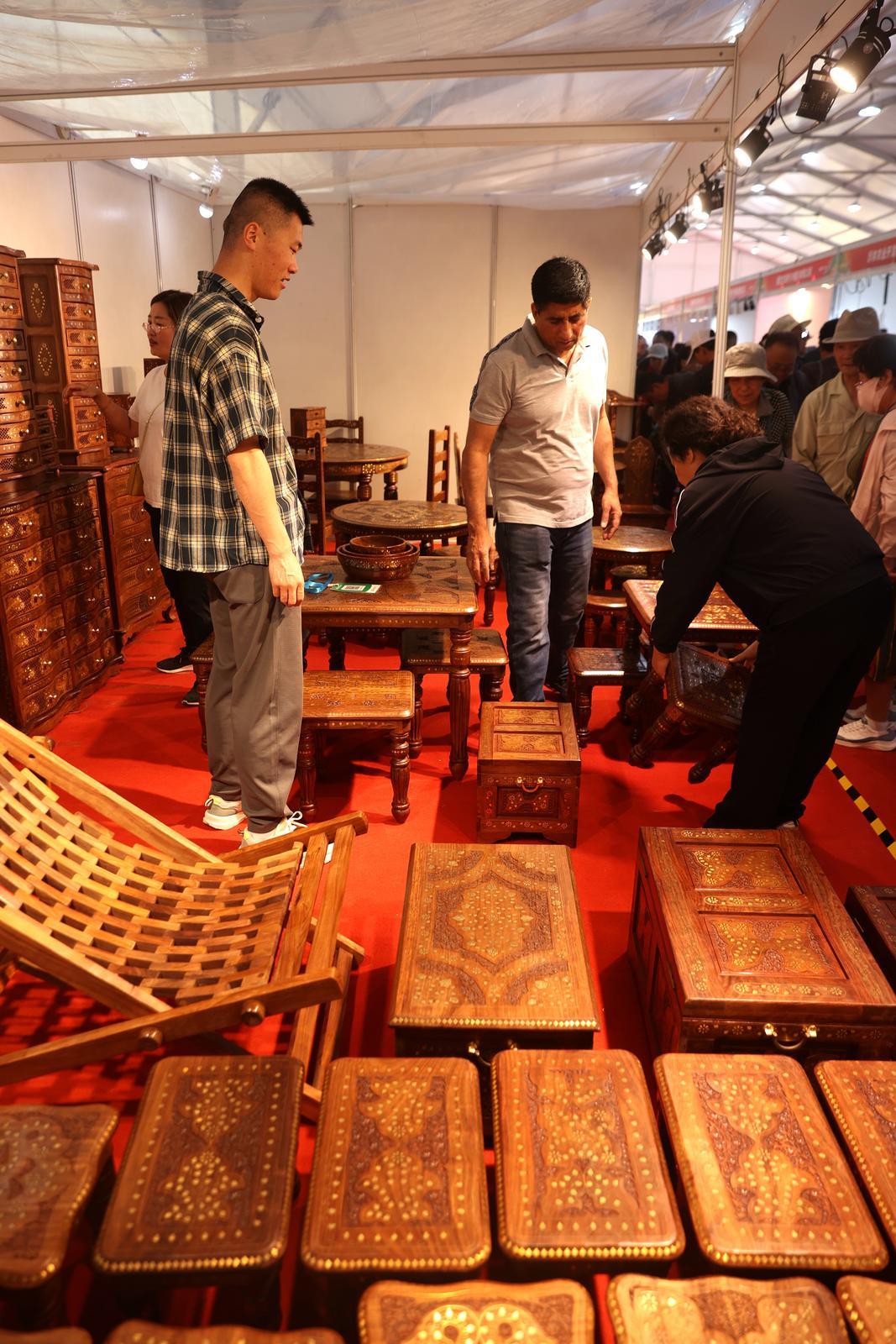 非遺沉浸式區(qū)展棚內(nèi),游客選購(gòu)巴基斯坦木質(zhì)家具器物。