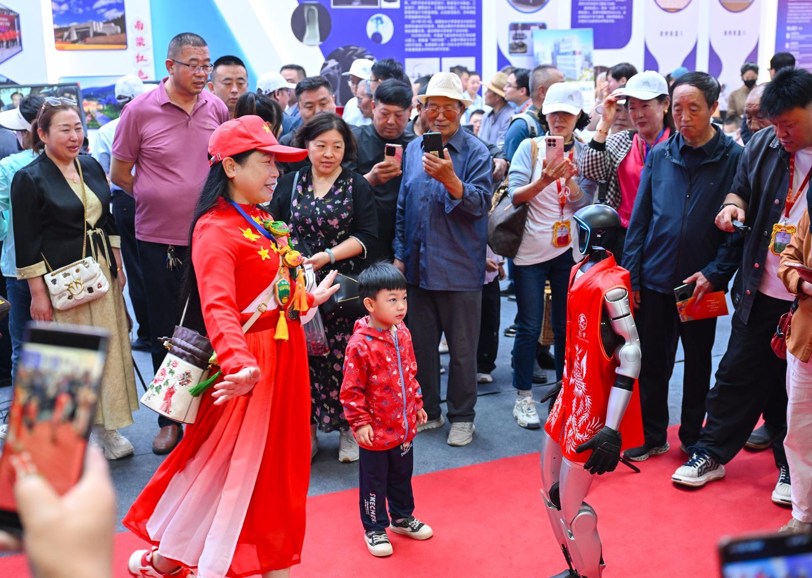 自媒體主播與智慧文旅館機(jī)器人互動(dòng)。