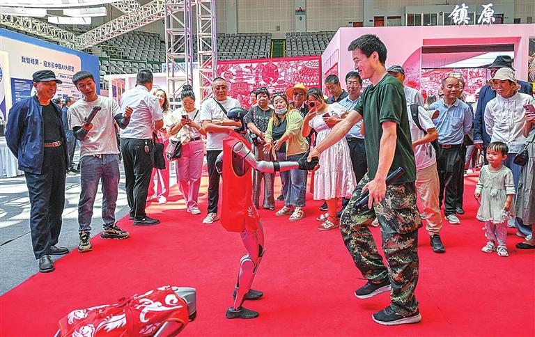 游客與身著慶陽剪紙元素服飾的機器人互動。陳飛