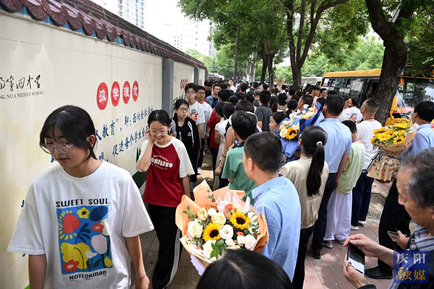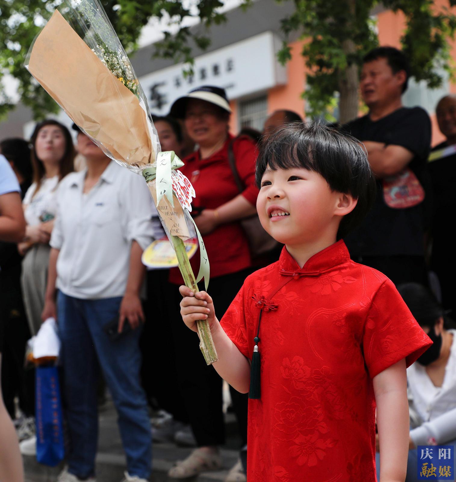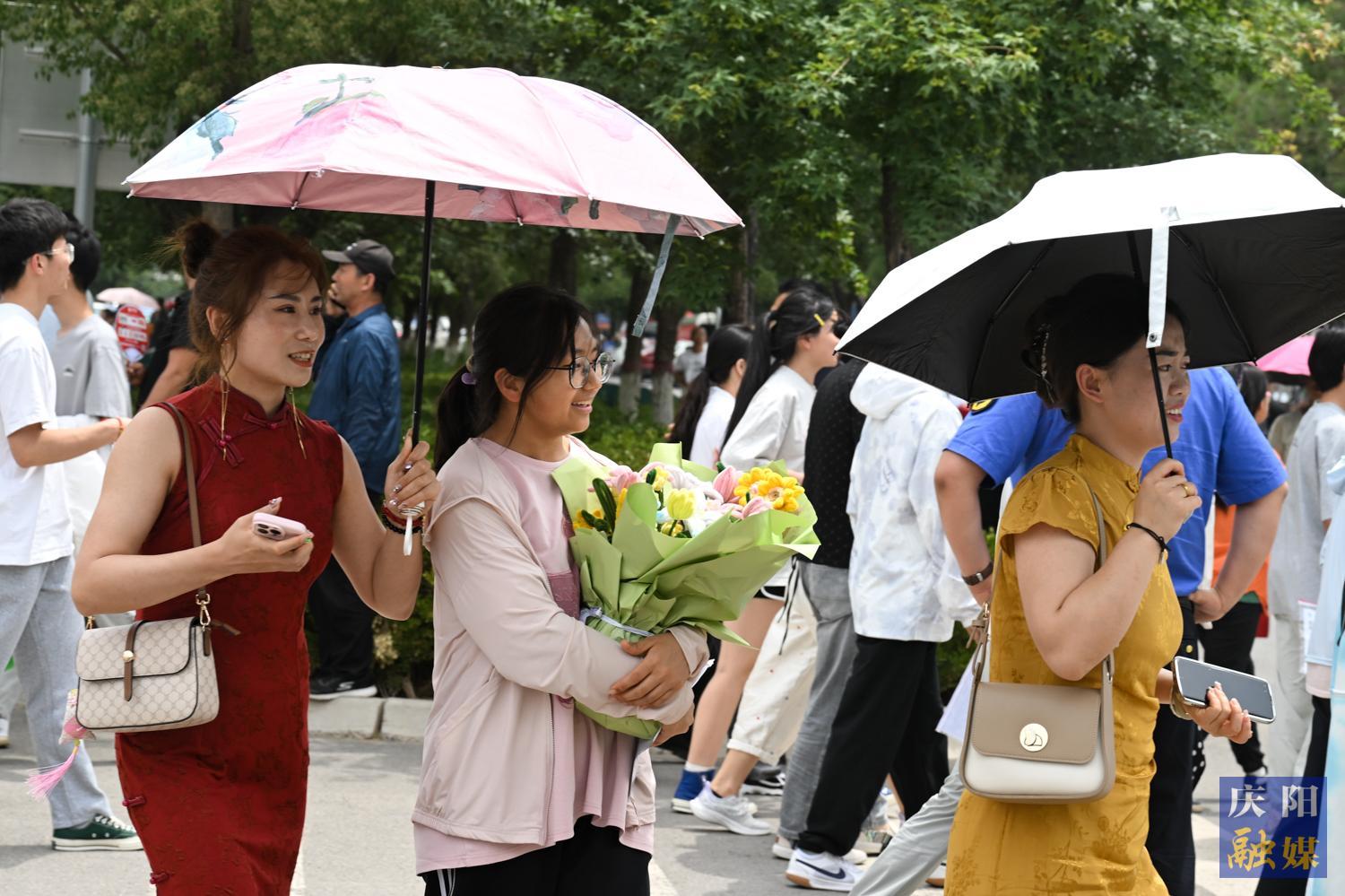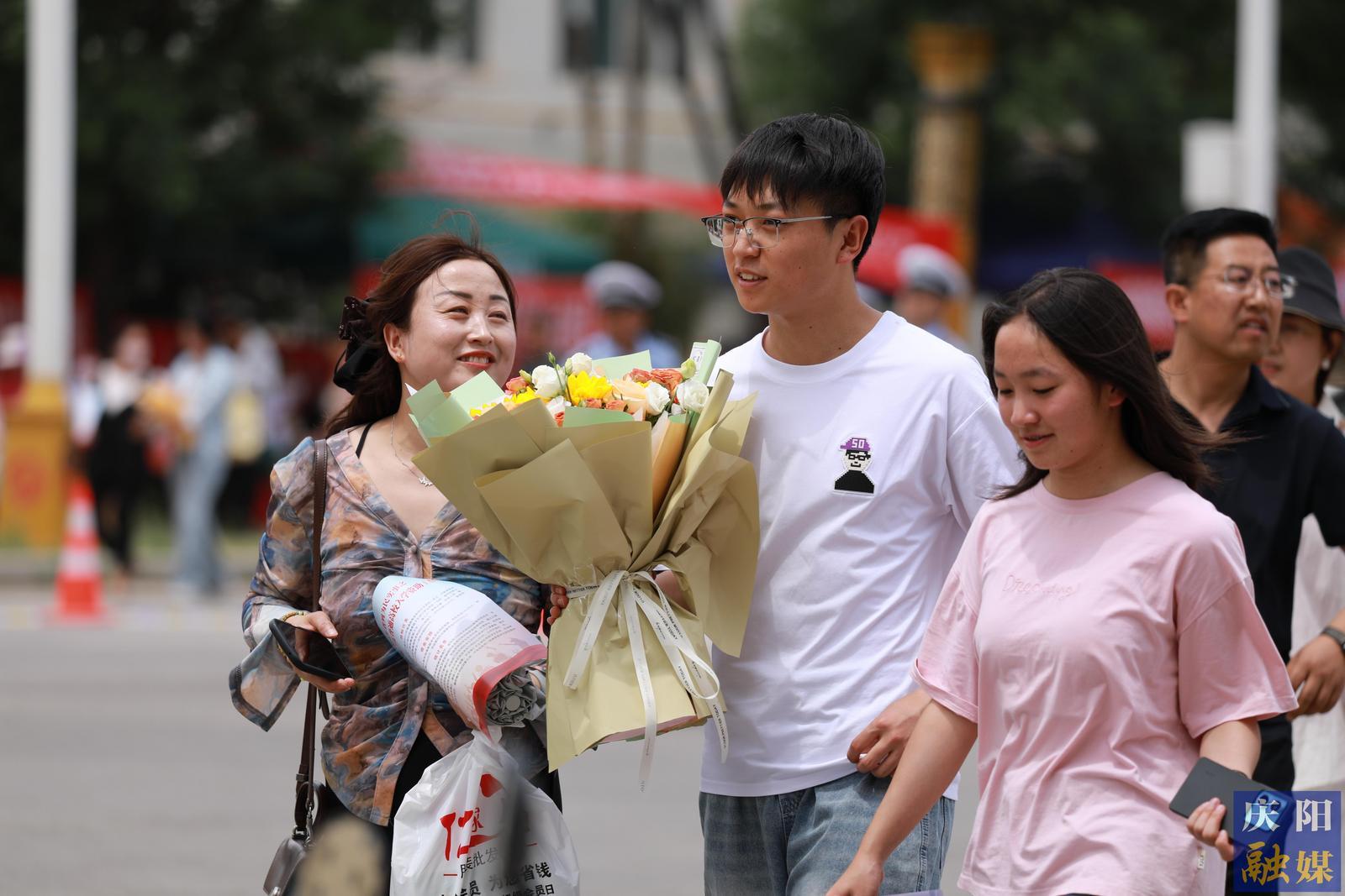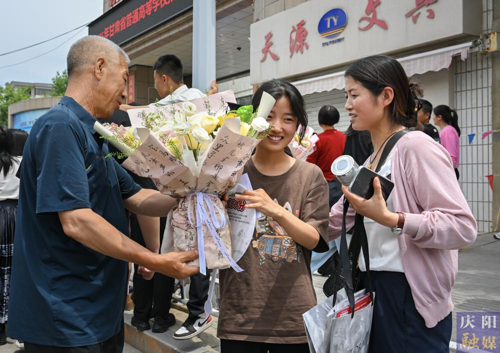 家長為結束“首戰(zhàn)”的考生遞上鮮花以示鼓勵。