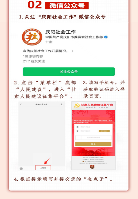 線上渠道。建議人可通過掃描慶陽市人民政府門戶網站“慶陽人民建議征集”二維碼飄窗,或關注“慶陽社會工作”微信公眾號,通過“人民建議”窗口提交建議。