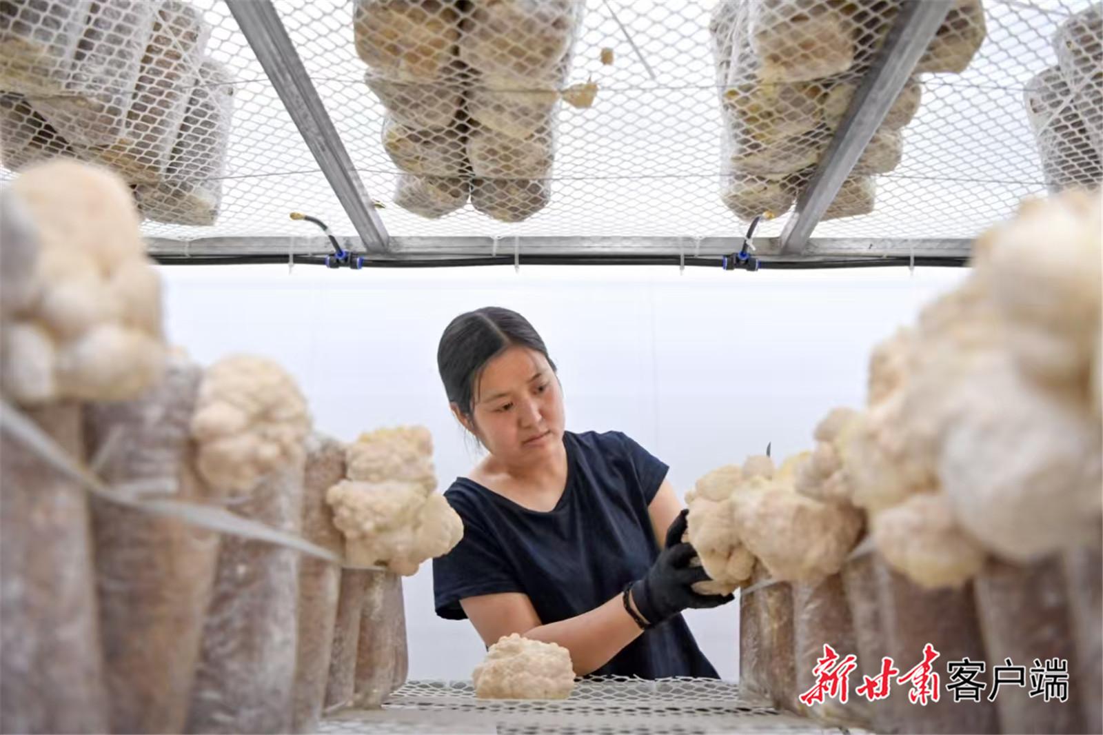 工人正在眾澤康藥食用菌種植示范基地采摘新鮮的猴頭菇。