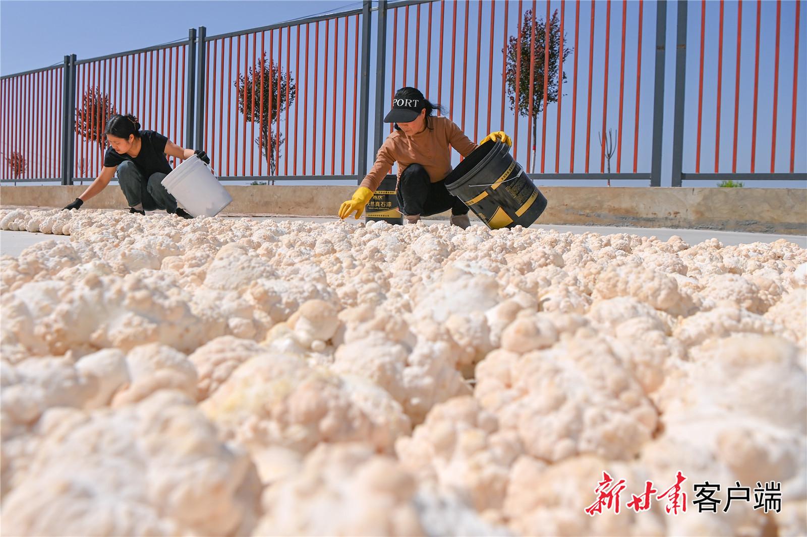 工人們晾曬采摘的猴頭菇。