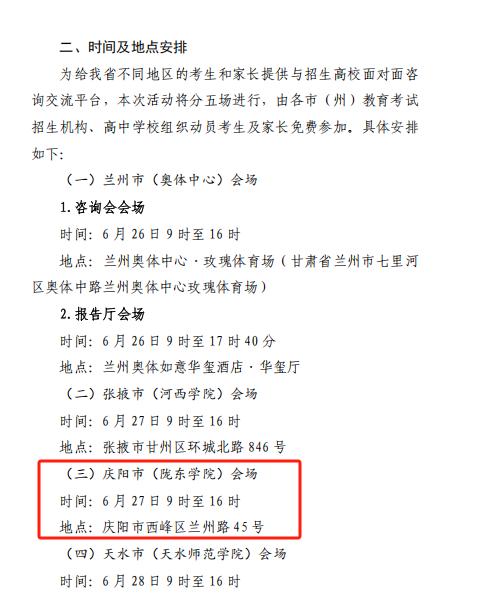 慶陽(yáng)網(wǎng)訊(慶陽(yáng)融媒記者 劉英娟)為深入貫徹落實(shí)教育部“高考護(hù)航行動(dòng)”要求,服務(wù)甘肅省高考考生及家長(zhǎng),6月27日9時(shí)至16時(shí),2025年甘肅省普通高校招生咨詢會(huì)將在隴東學(xué)院舉辦。