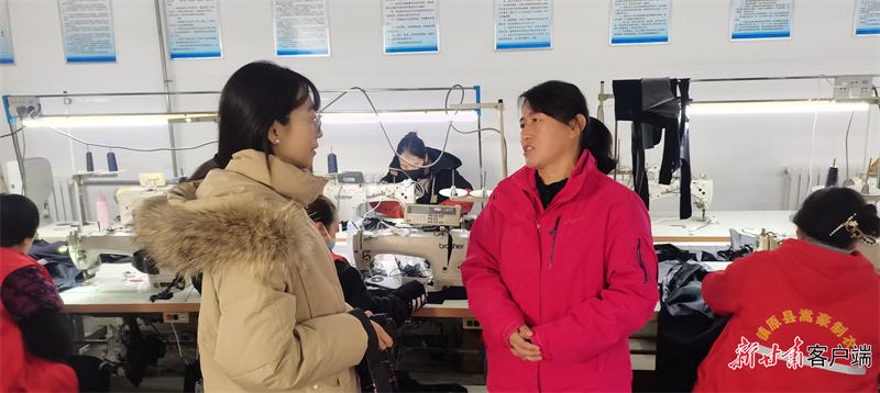 馬銀萍(右二)調(diào)研村里服裝加工廠經(jīng)營情況。