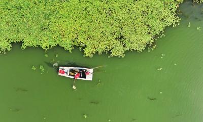 山東郯城縣郯城街道十里村黨員志愿者在白馬河濕地公園清理打撈水面漂浮物。新華社發(fā)