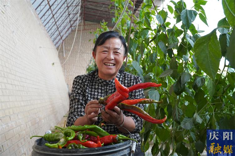 ▲關(guān)營村村民杜花采摘新鮮辣椒。
