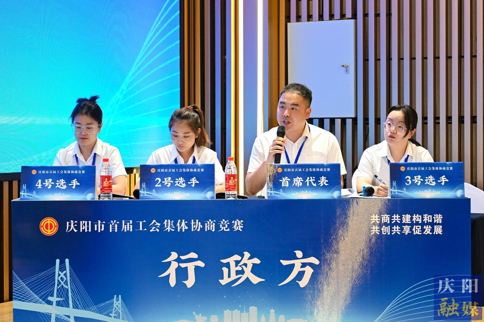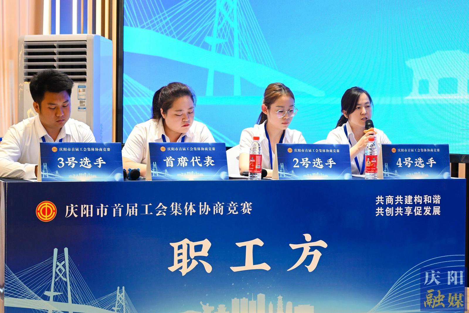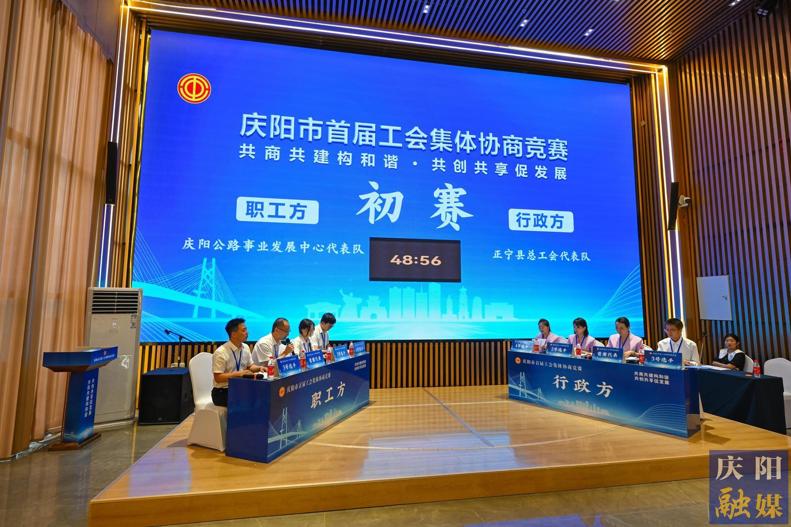 初賽第一輪:職工方慶陽公路事業(yè)發(fā)展中心代表隊與行政方正寧縣總工會代表隊協(xié)商現(xiàn)場。