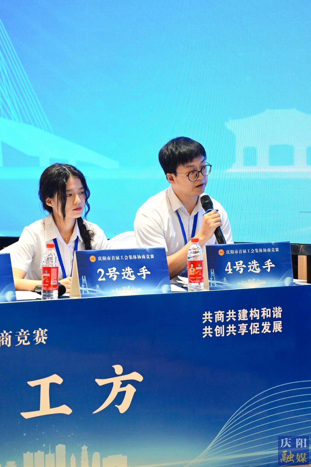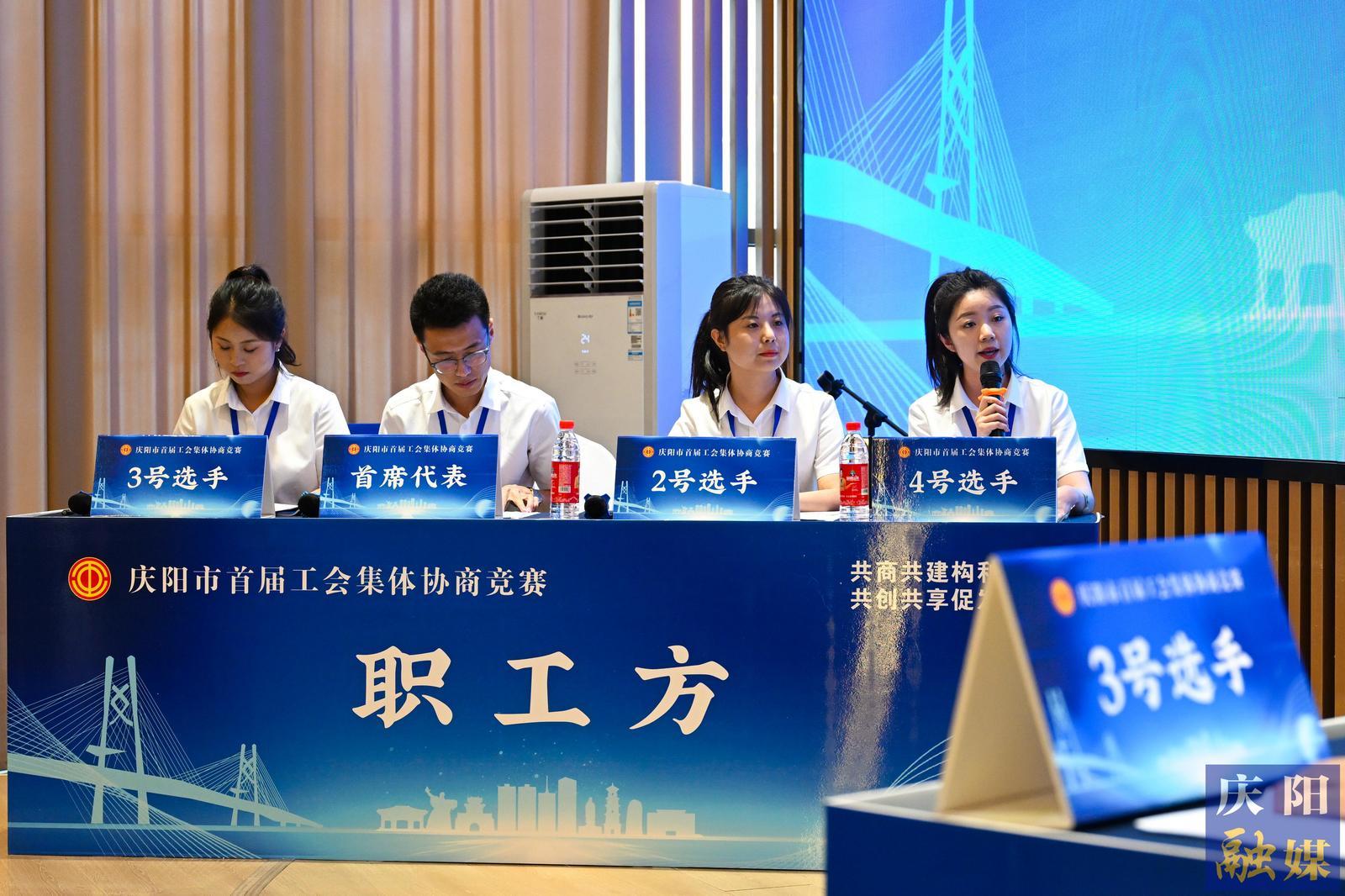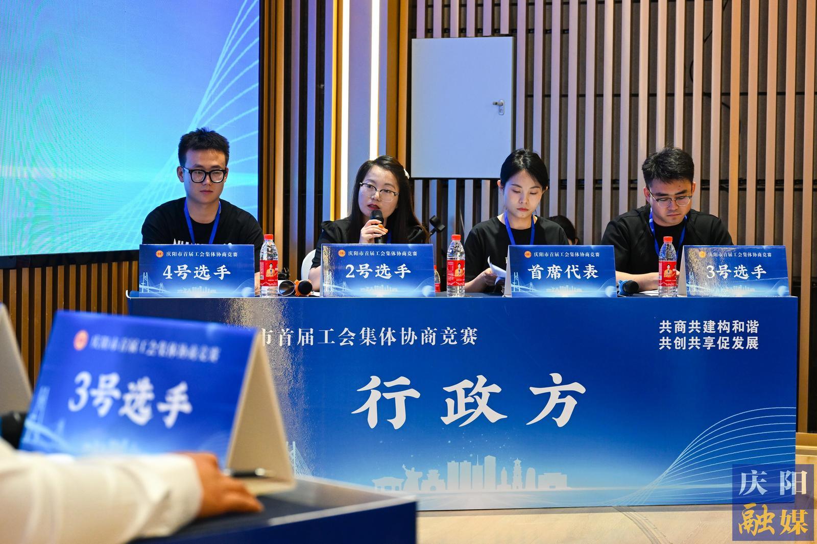 初賽第一輪:職工方慶陽公路事業(yè)發(fā)展中心代表隊與行政方正寧縣總工會代表隊協(xié)商現(xiàn)場。