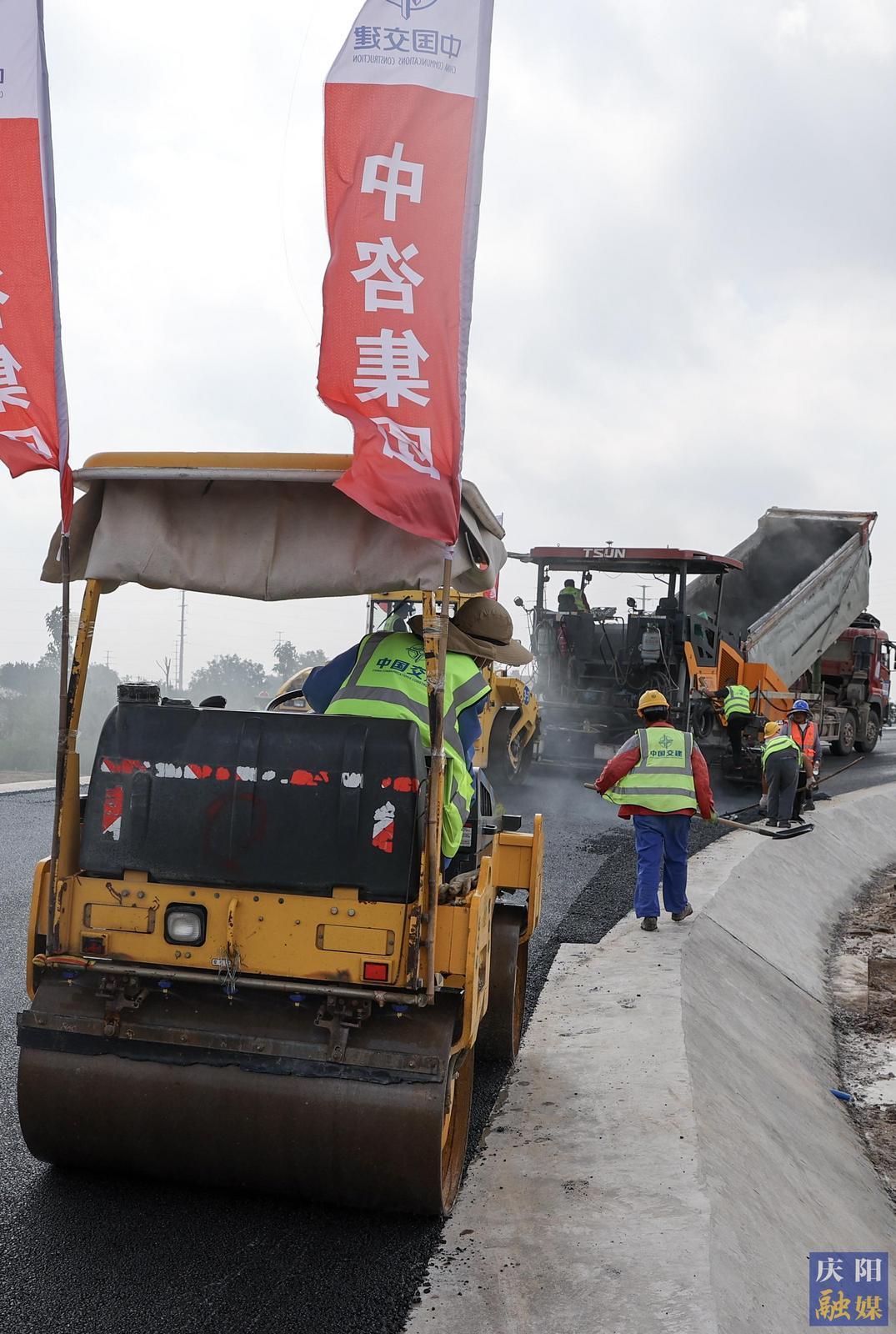 西峰東樞紐立交工人正在進(jìn)行瀝青面層鋪設(shè)。